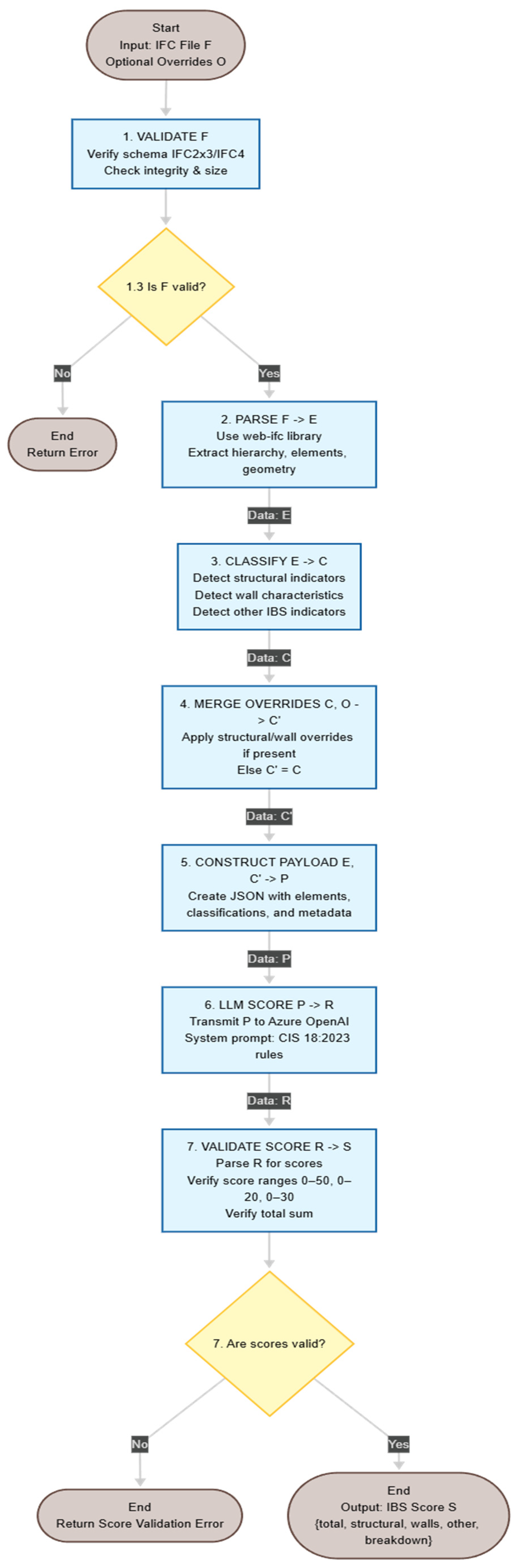 Novel Integration Pattern: First documented integration combining web-based IFC processing, n8n visual workflow automation, and LLM-powered scoring engines for automated IBS assessment, establishing a replicable architectural pattern for construction analytics applications. Methodological Contribution: A formal methodology for translating regulatory scoring frameworks (CIS 18:2023) into LLM-executable prompt specifications through structured prompt engineering, temperature control strategies, and validation protocols. Practical Implementation: A functioning system with real IFC model processing capabilities, validating technical feasibility and identifying implementation considerations that emerge through actual deployment [