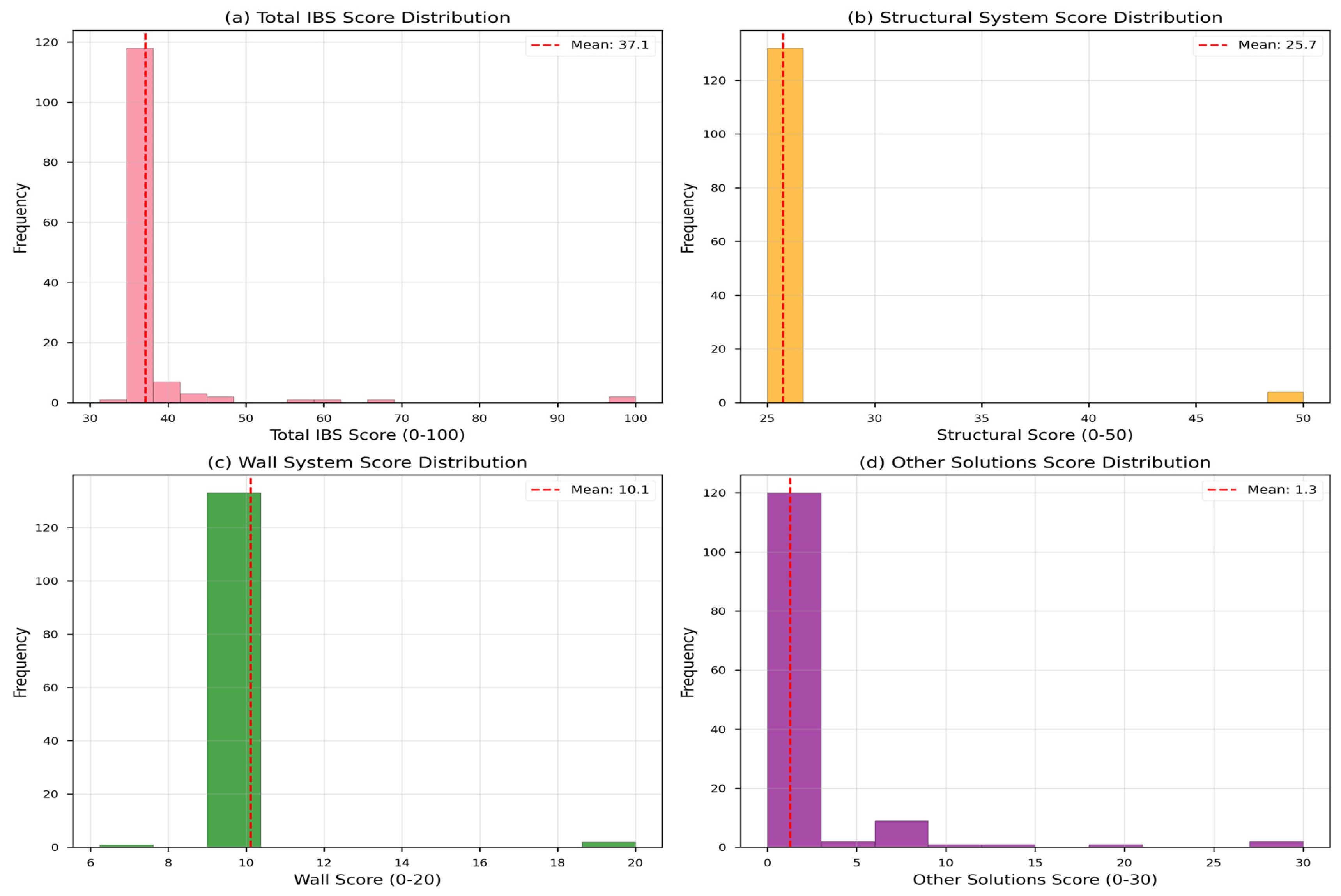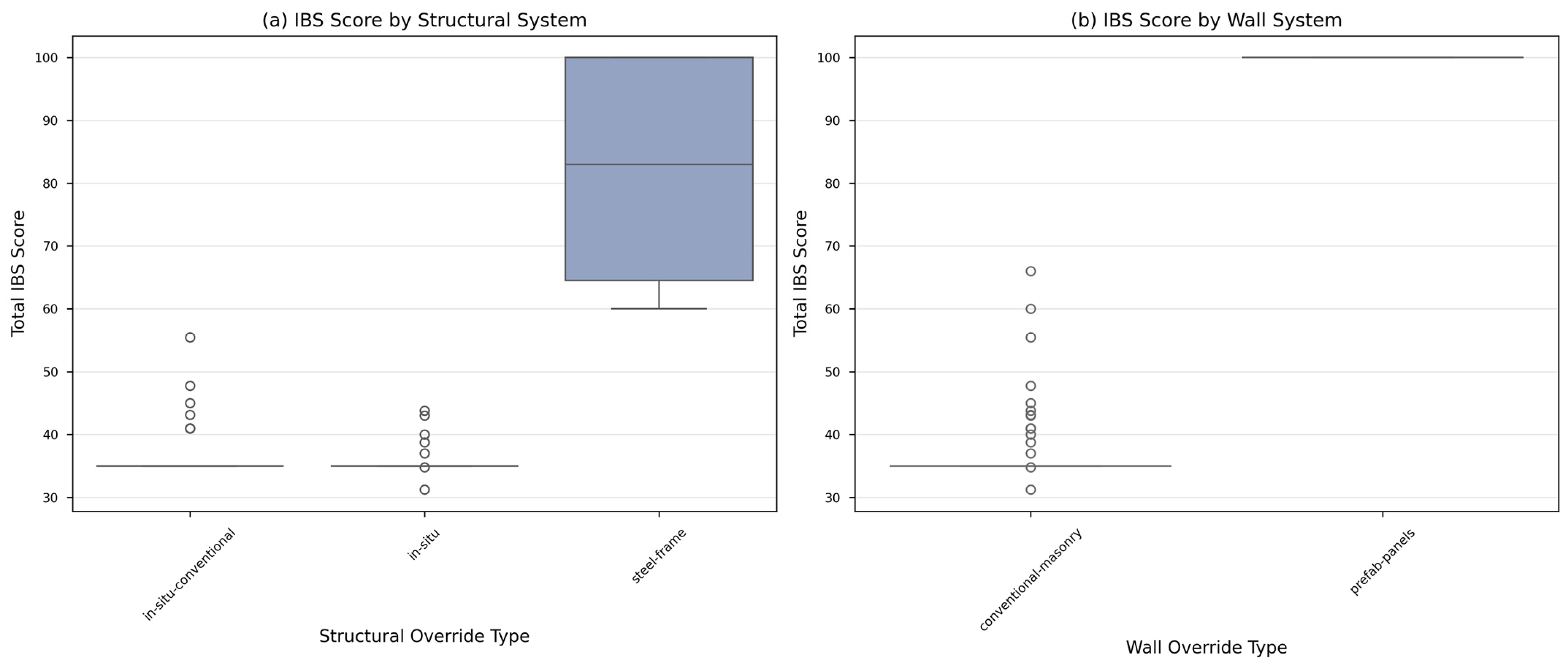 Figure 6, demonstrated the sensitivity of total IBS scores to system classification decisions. Buildings classified as steel frame construction achieved substantially higher mean scores (81.50 points, SD = 21.50,