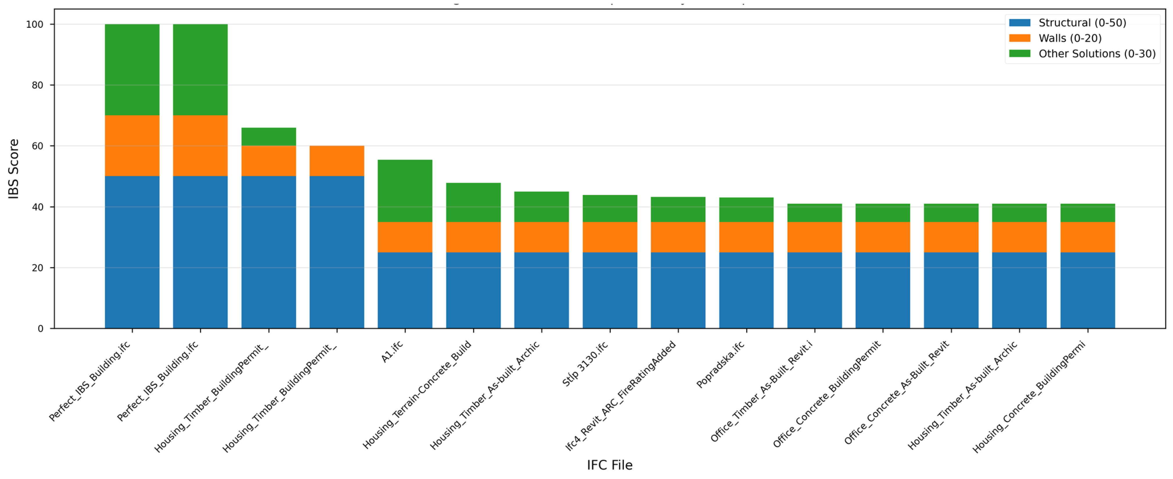 The highest-scoring model (PerfectIBSBuilding.ifc, 100.00 points) achieved maximum points in all three categories, representing an idealized fully industrialized building designed specifically to validate scoring algorithm implementation. Production buildings with substantial industrialization adoption (ARK_NordicLCA models) achieved total scores between 41.00 and 66.00 points, demonstrating practical upper bounds for contemporary construction projects incorporating timber structural systems, prefabricated wall panels, and systematic modularization strategies.