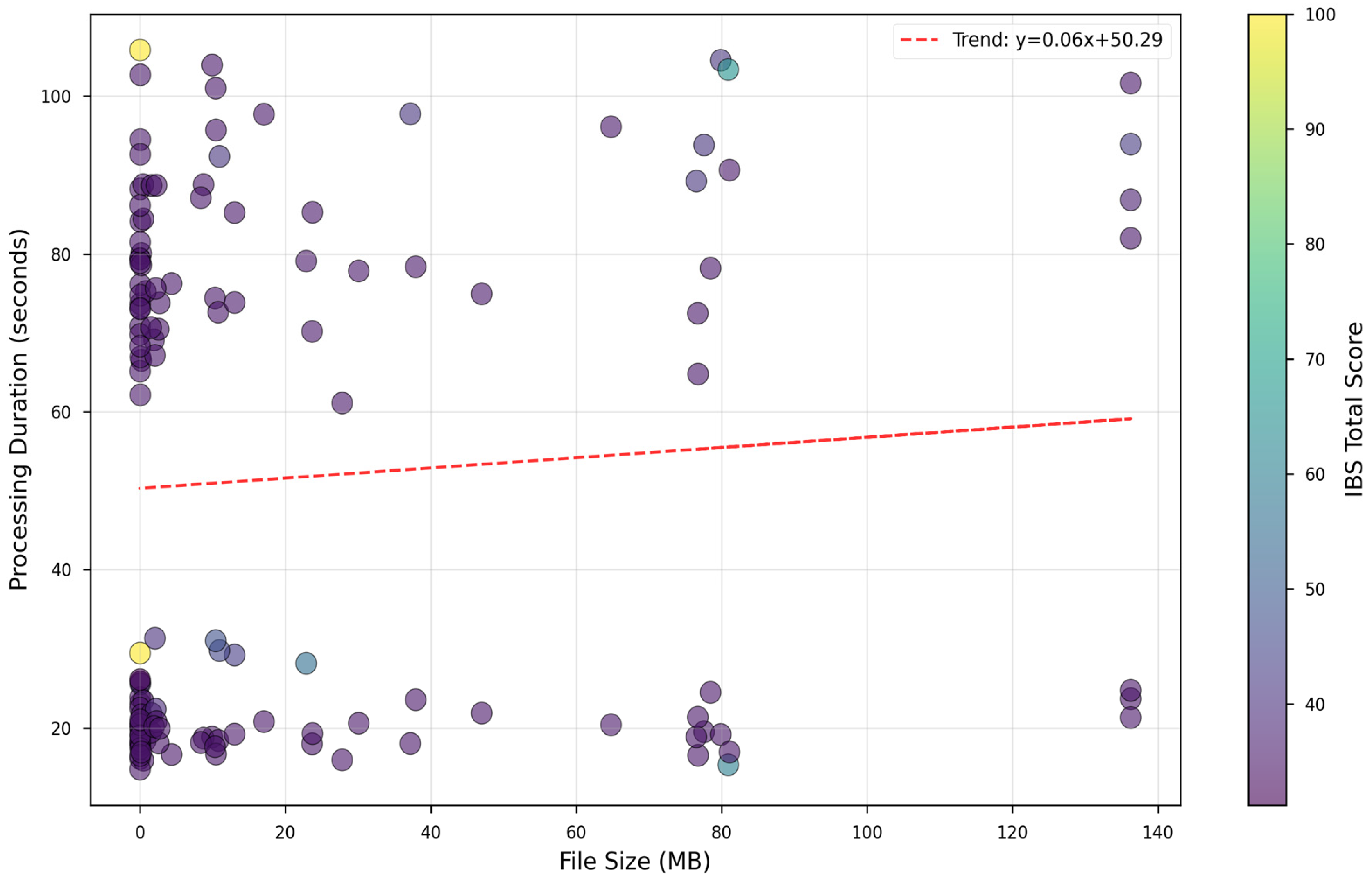 Figure 5, demonstrated approximately linear scaling with positive correlation (R = 0.42). Processing times ranged from 14.79 s for minimal test models to 105.84 s for comprehensive building developments, with a median duration of 61.62 s. The linear trend line indicated processing overhead of approximately 0.67 s per megabyte of input data, though substantial variance existed around this central tendency, reflecting differences in model complexity, entity count, and AI inference latency variability.