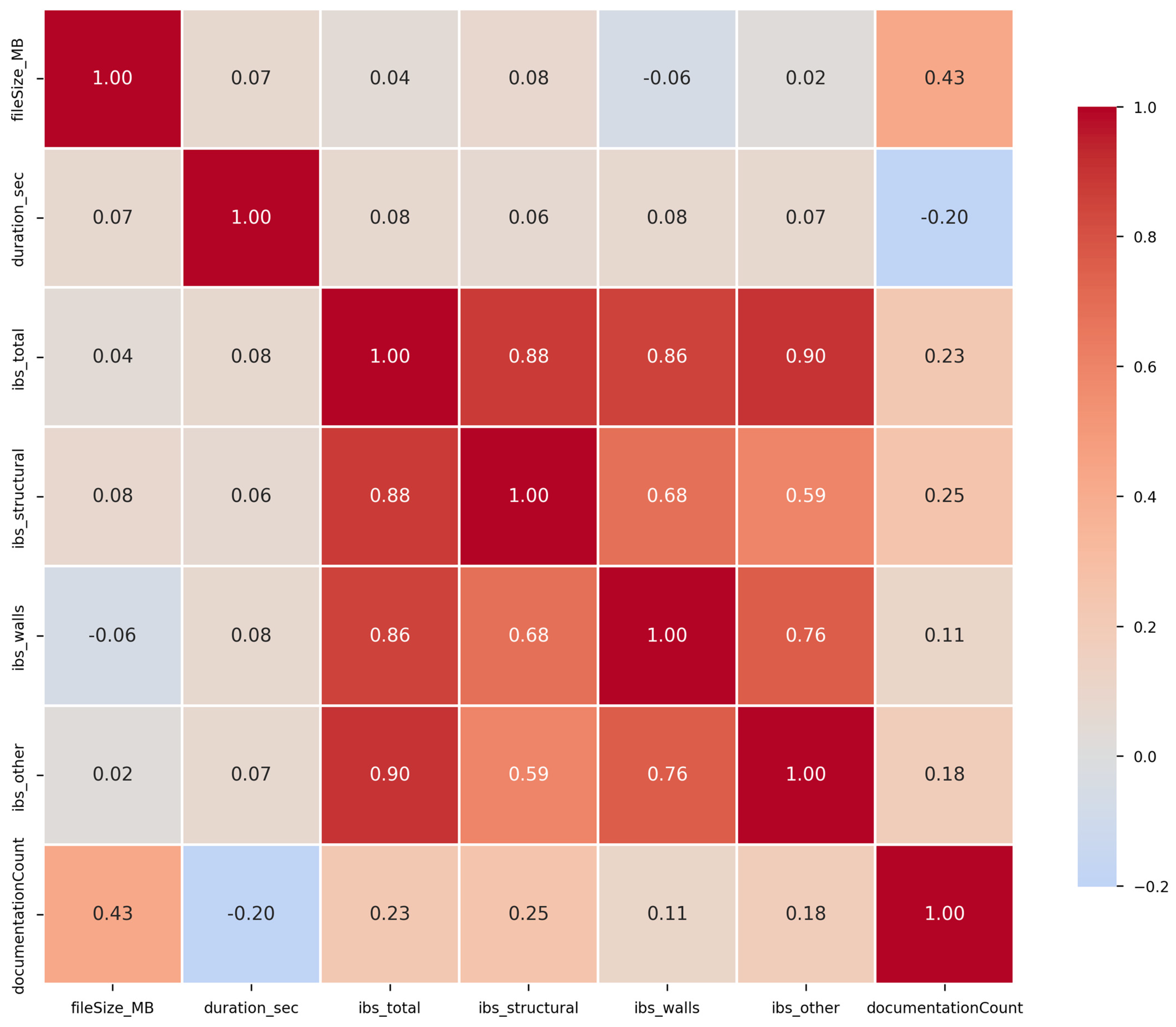 Figure 7, revealed several noteworthy relationships among measured variables. File size exhibited a weak positive correlation with processing duration (r = 0.42) and a negligible correlation with IBS scores, confirming the independence of industrialization assessment from model complexity. The three scoring components (structural, walls, and other) demonstrated minimal intercorrelation, validating the CIS 18:2023 methodology’s treatment of these categories as independent assessment dimensions. Documentation attachment count showed negligible correlation with any outcome variable (|r| < 0.10), suggesting that supplementary PDF documentation influenced scoring through content-based mechanisms rather than mere presence/absence effects. Processing duration correlated weakly with structural scores (r = 0.18) and wall scores (r = 0.15), potentially reflecting increased AI reasoning complexity when evaluating industrialized construction systems requiring interpretation of multiple IBS factor tables and additional factor calculations.
