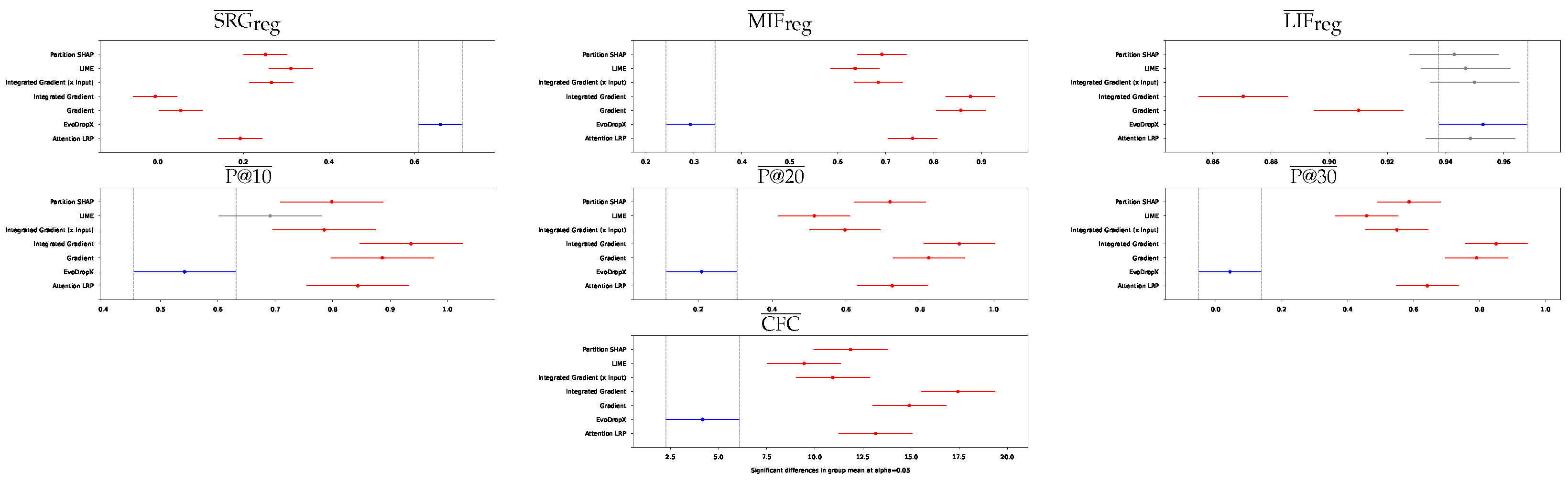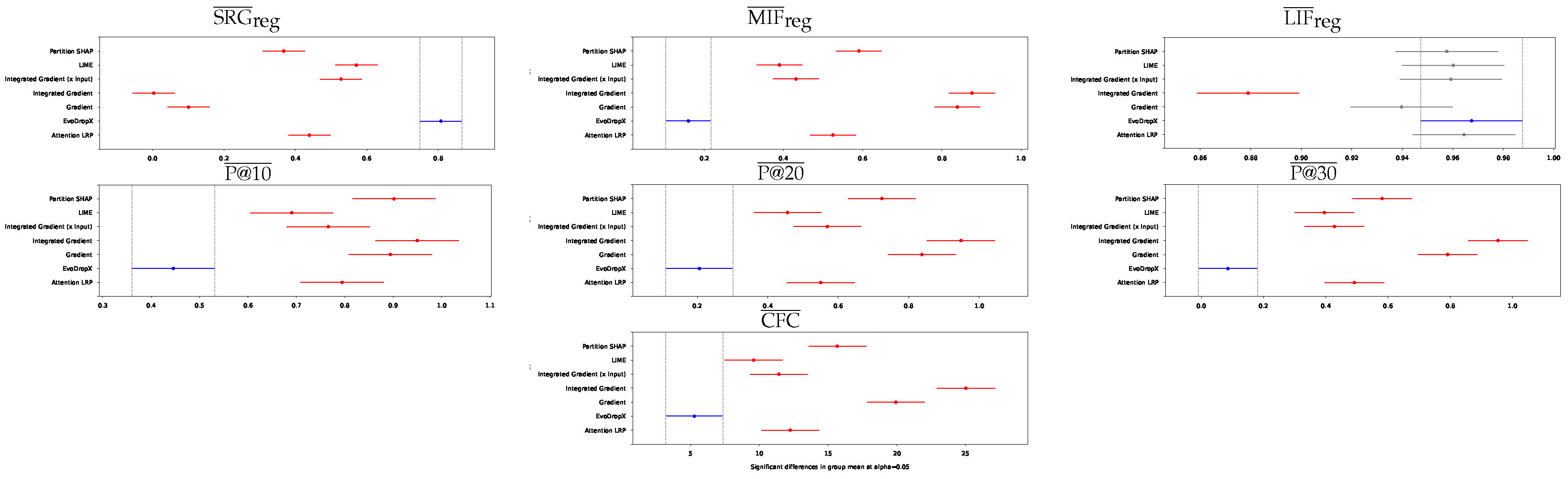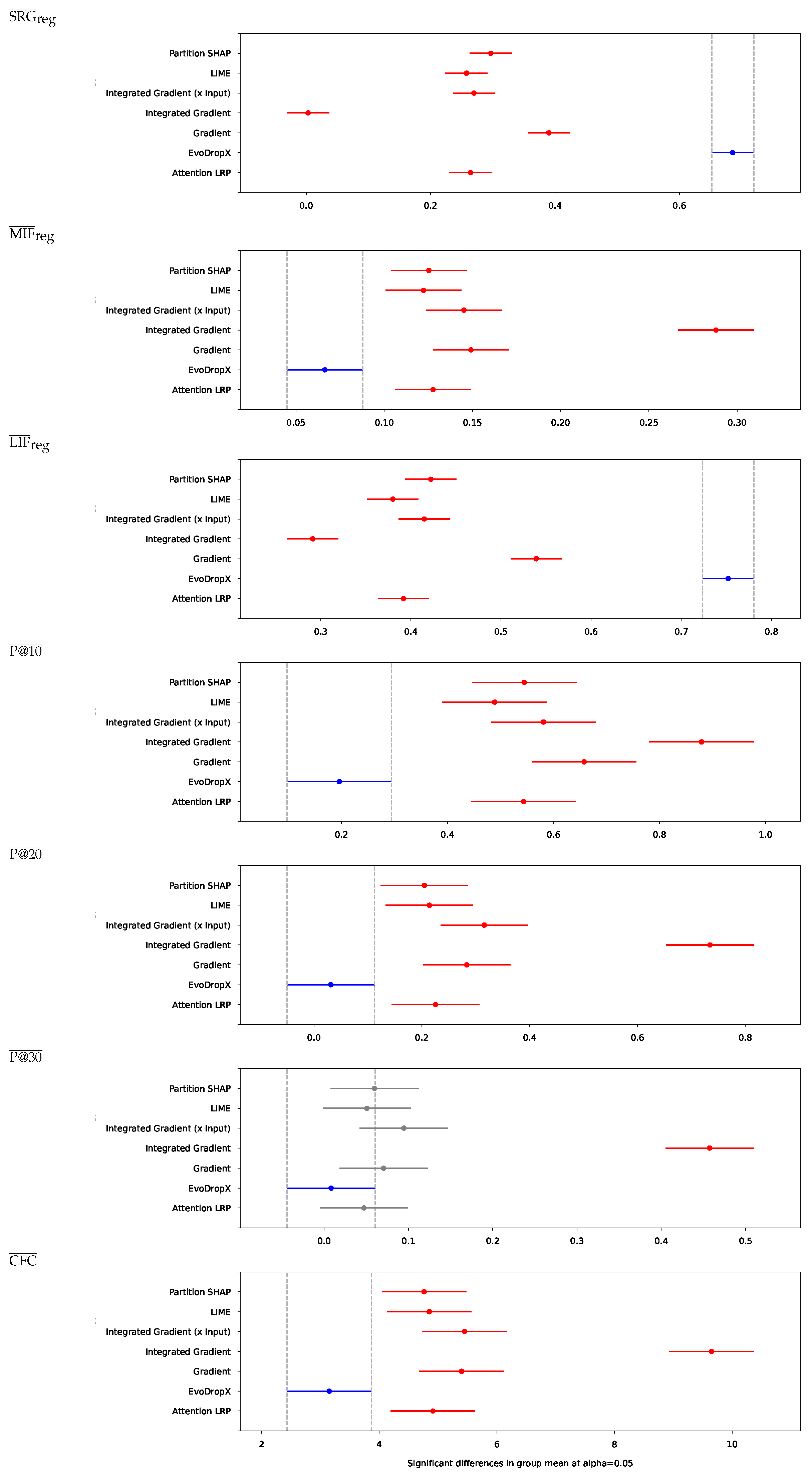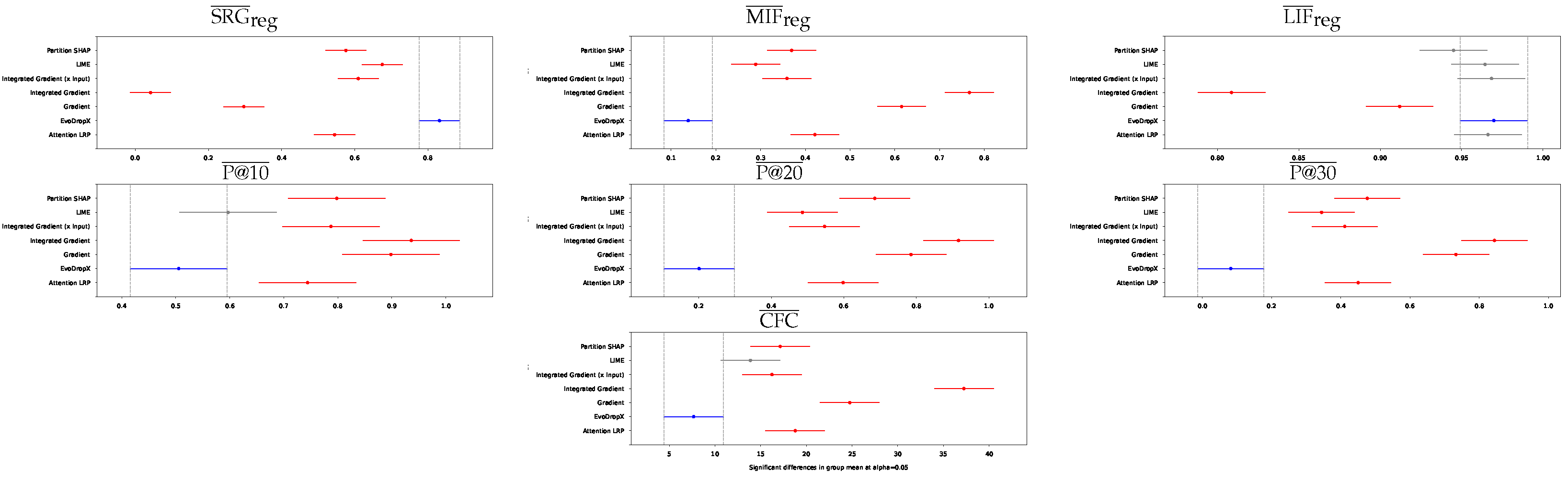 | Dataset | Model | Metric | EvoDropX | AttnLRP | SHAP | LIME | Gradient | IG | IG × Input | p-Value |