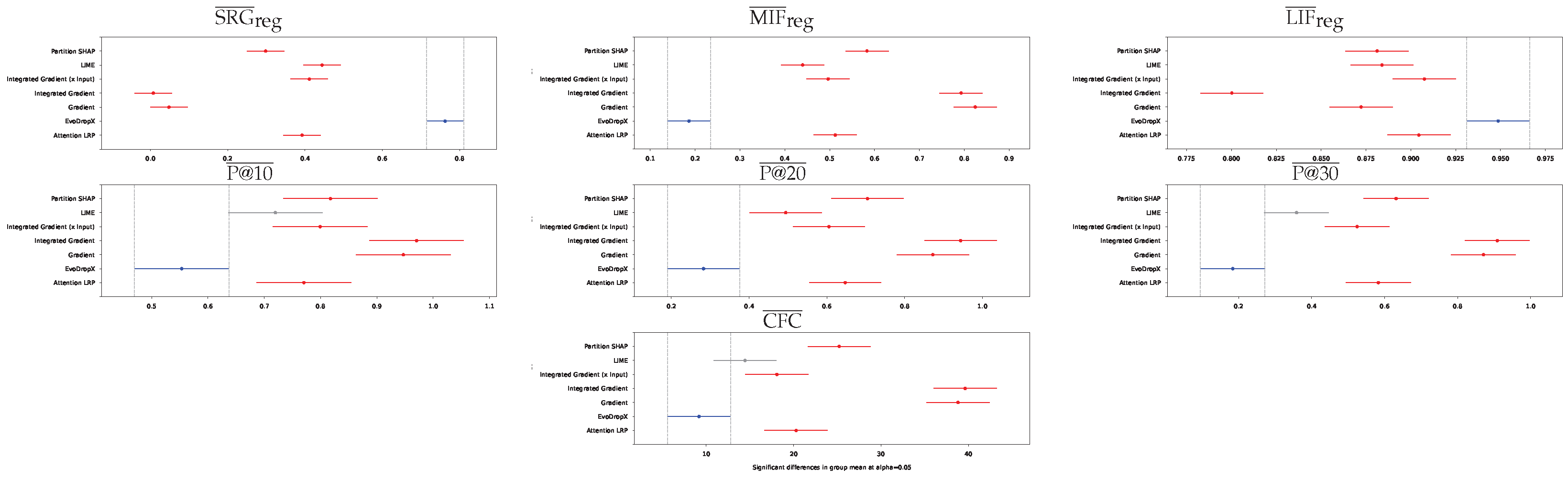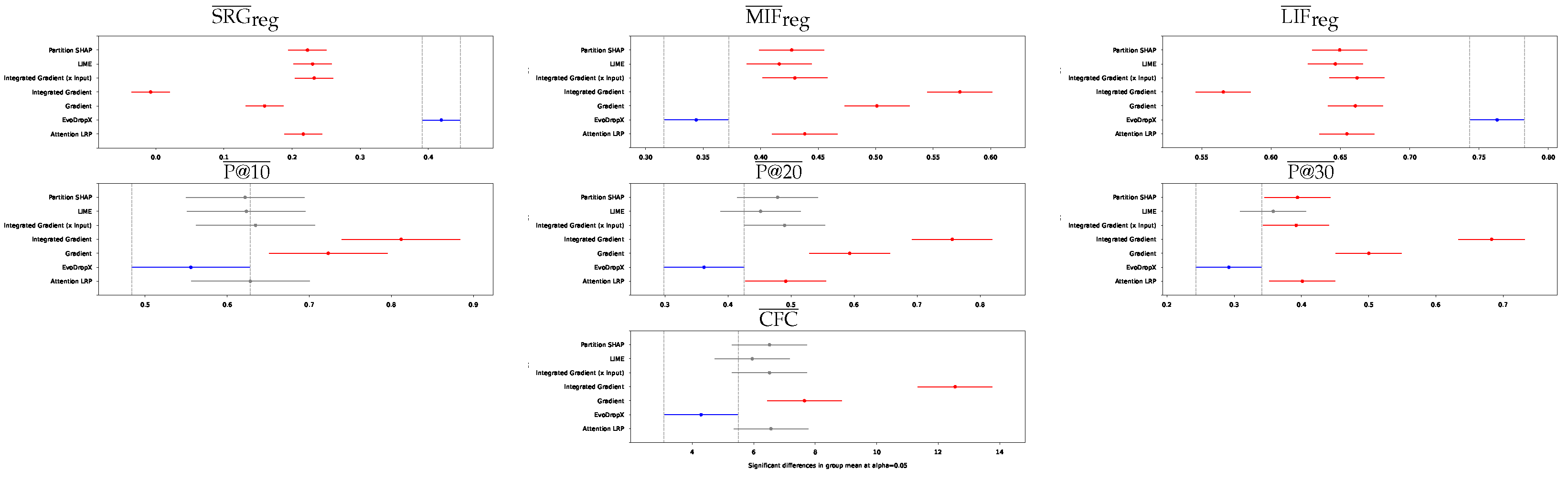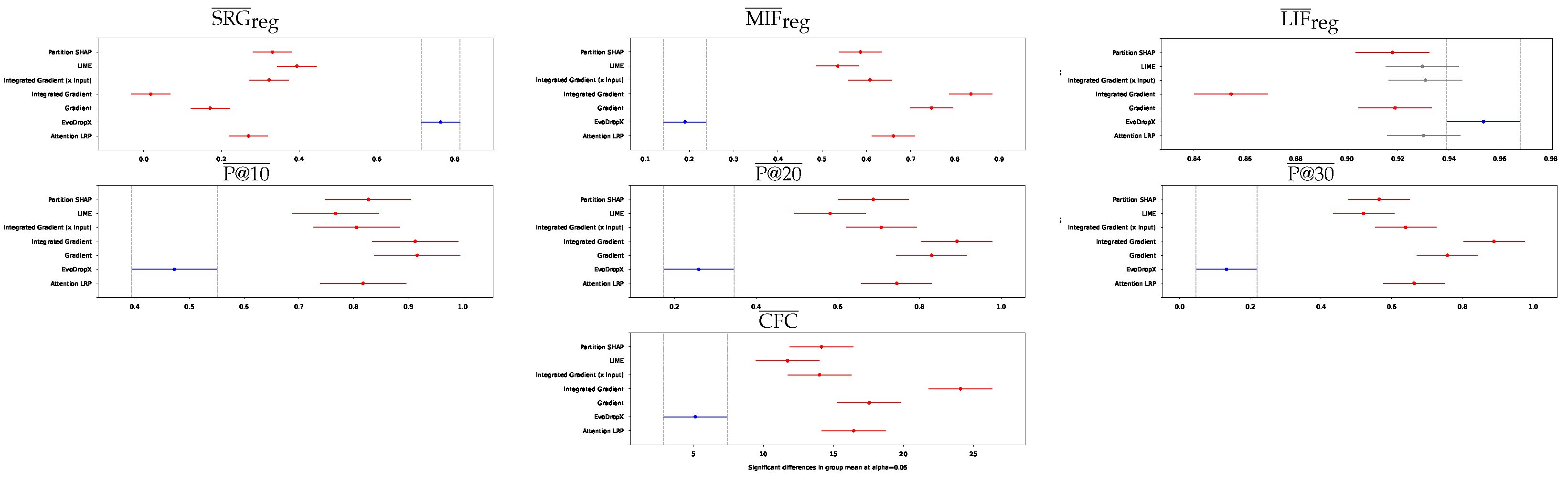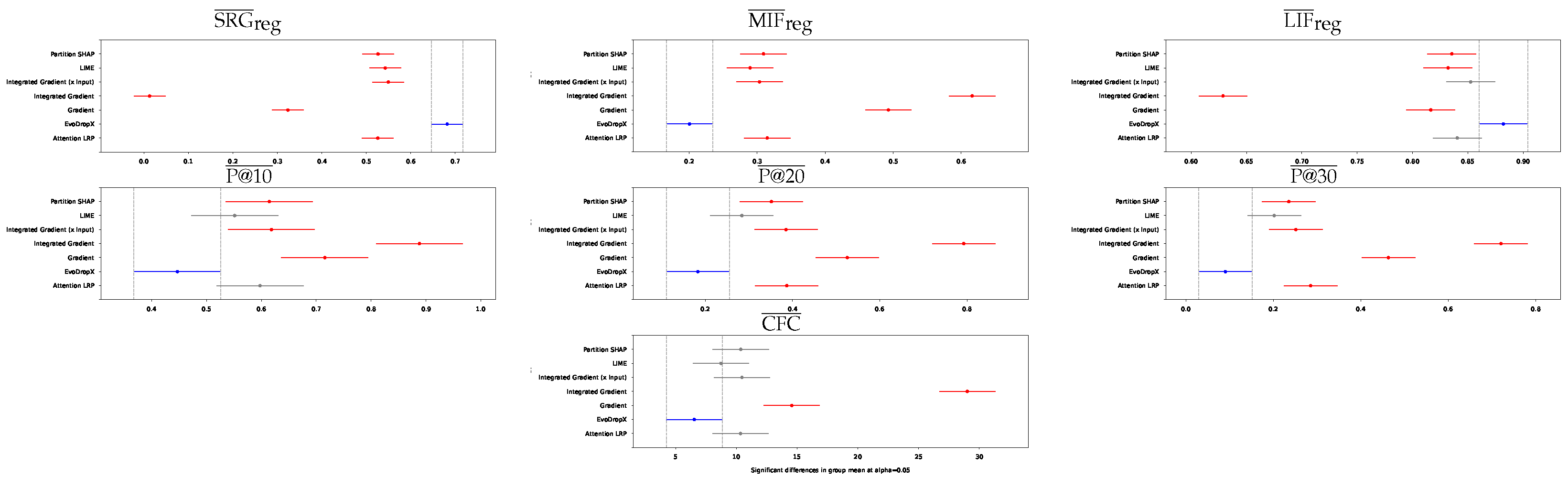 | Dataset | Model | Metric | EvoDropX | AttnLRP | SHAP | LIME | Gradient | IG | IG × Input | p-Value |