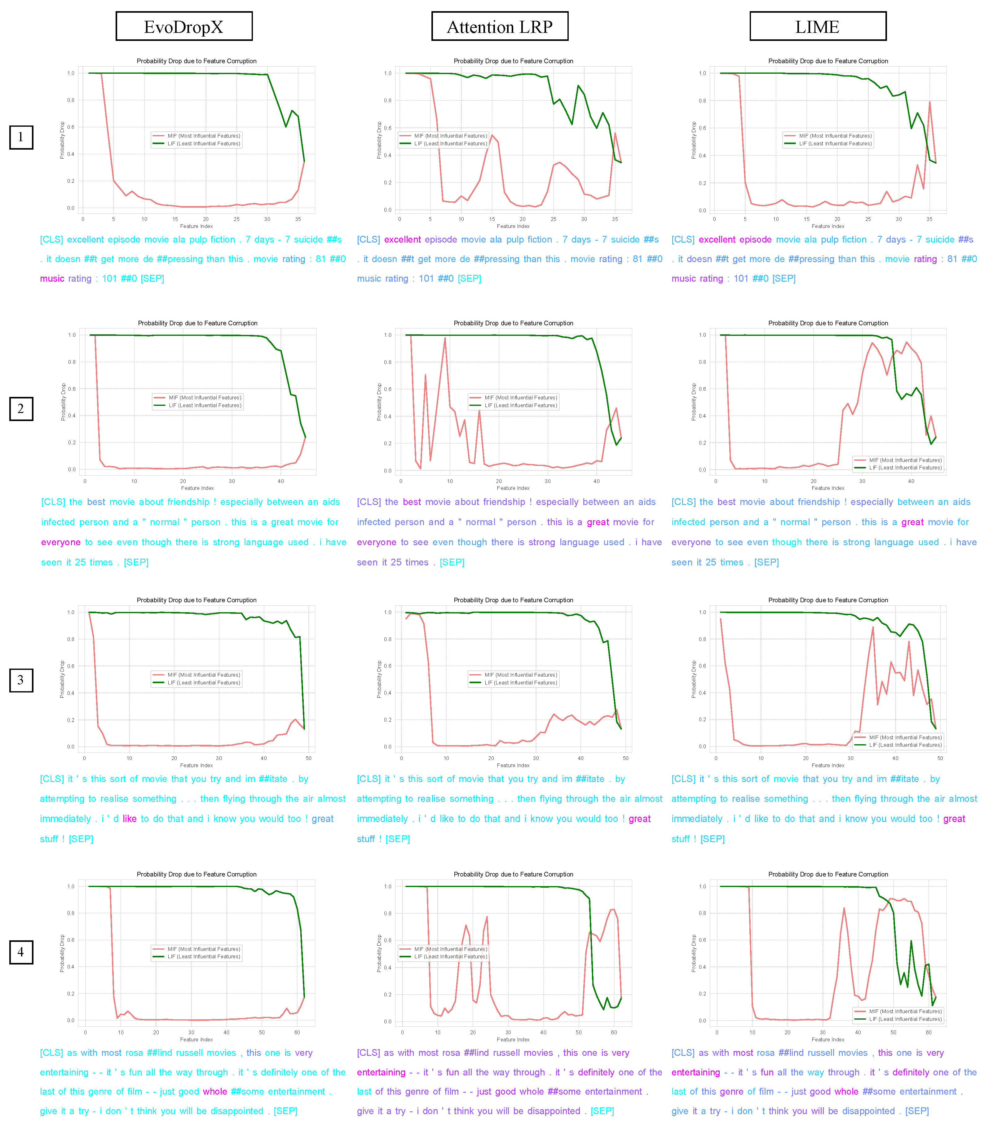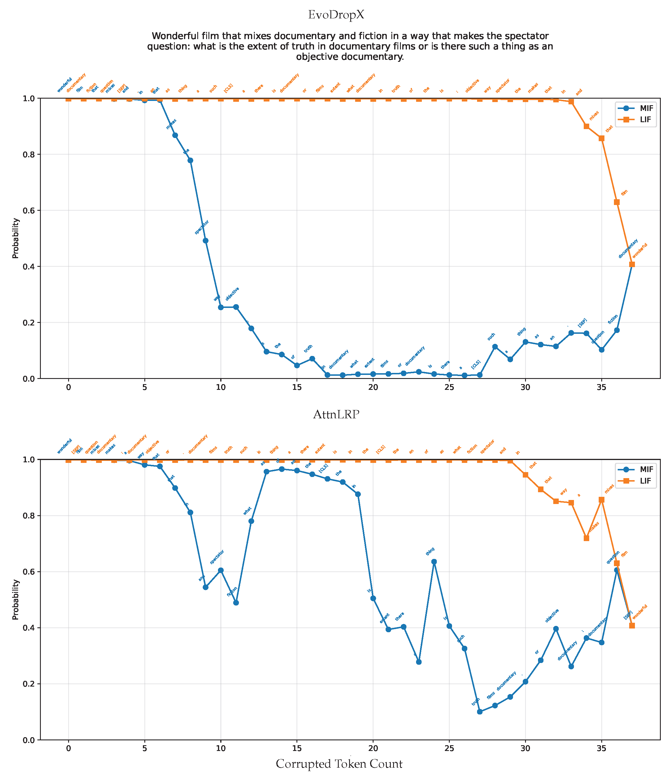 - Regularised MIF: This metric measures the area under the MIF curve, normalised by sentence length:where and denote the model’s confidence in the originally predicted class as features are progressively corrupted. Higher values indicate that the explanation method effectively distinguishes between important and unimportant features.