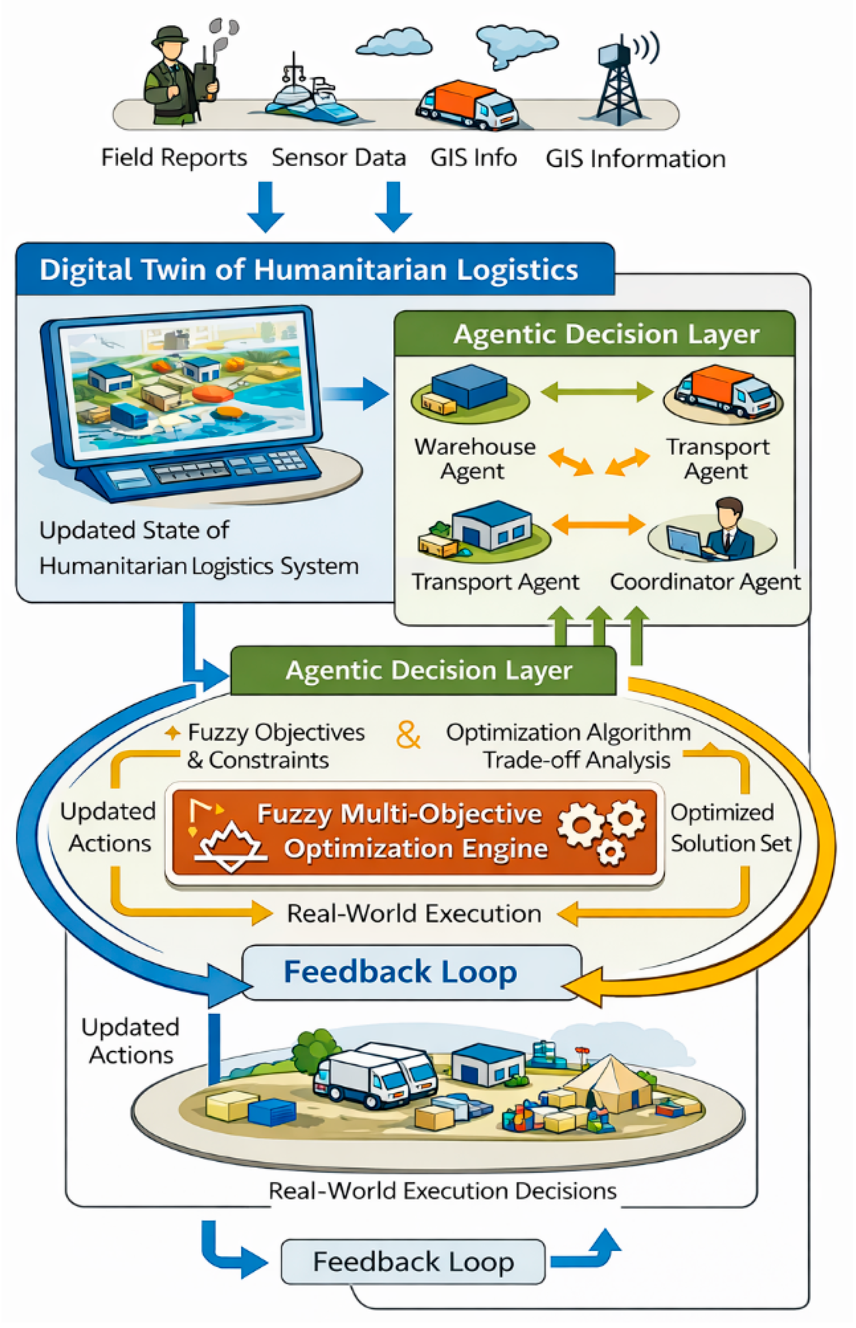 Aiming to fill this gap, the present study presents an integrated framework for humanitarian logistics in which fuzzy multi-objective optimization, digital twin, and agent-based intelligence are coherently combined. The main innovation of this study is that uncertainty is modeled not only as an extraneous parameter, but also as an intrinsic part of the decision-making process and is included in the structure of objectives and constraints through triangular fuzzy numbers. Furthermore, the digital twin is used as a dynamic mechanism to continuously update the system state and feed information back into the optimization process, rather than simply as a static simulation tool. Finally, agent-based intelligence plays an active role in guiding the selection of solutions across the Pareto front, enabling interpretability of decisions and their adaptation to changing preferences of decision makers.