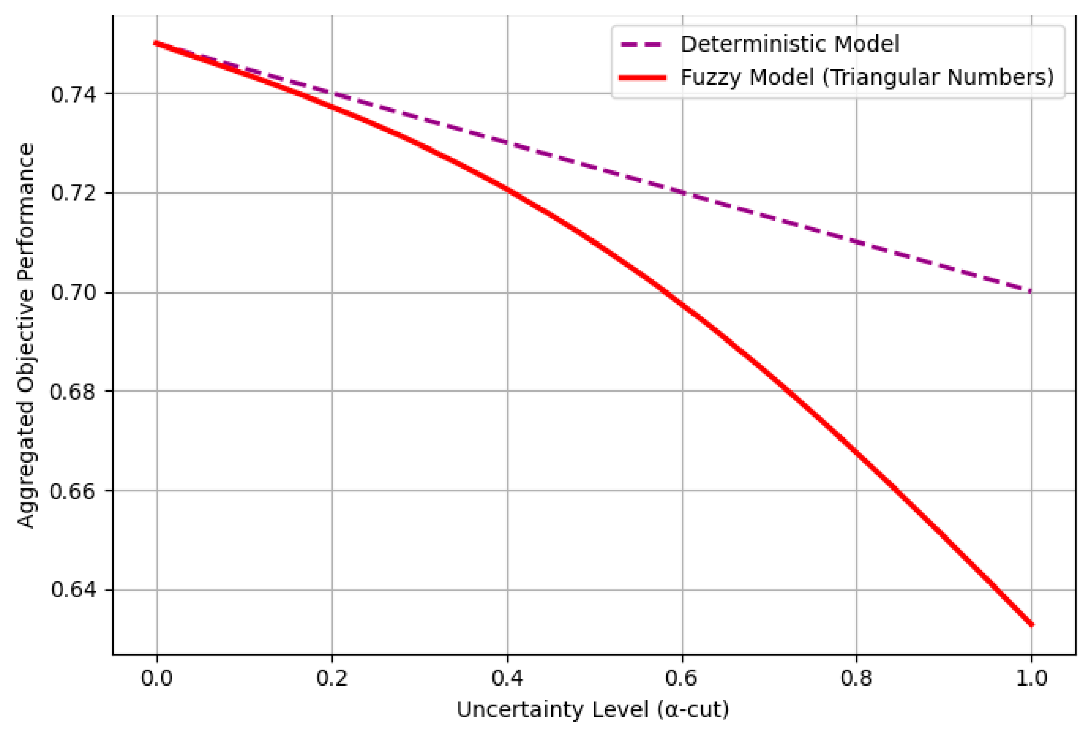 Table 4 presents the numerical results of the model performance at selected levels of uncertainty, allowing for a quantitative comparison between the fuzzy and deterministic models.