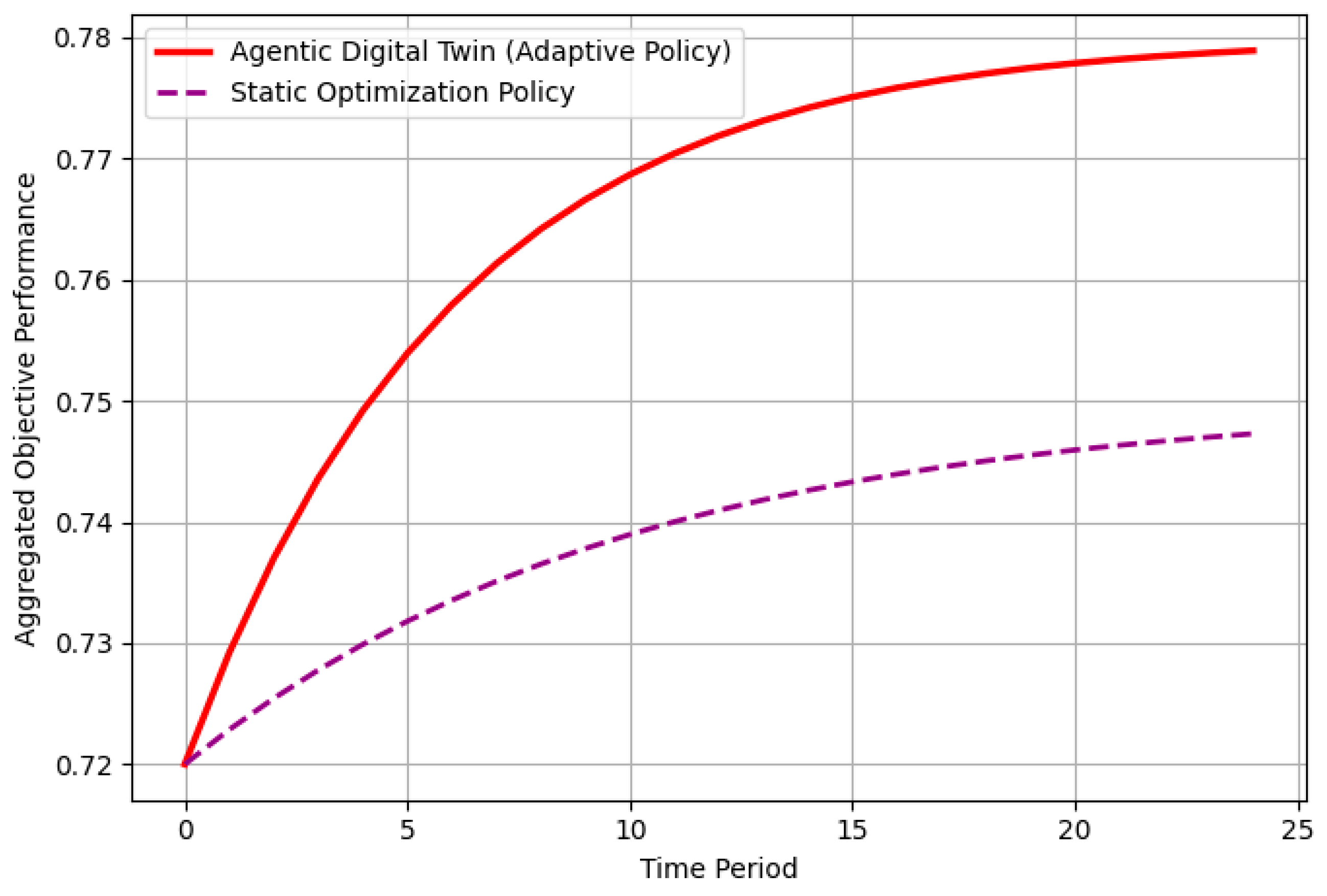 Figure 5 shows the trend of changes in the aggregated target performance over time for the two approaches. In this graph, the behavior of the agent-based digital twin-based adaptive policy is depicted versus a static optimization policy.