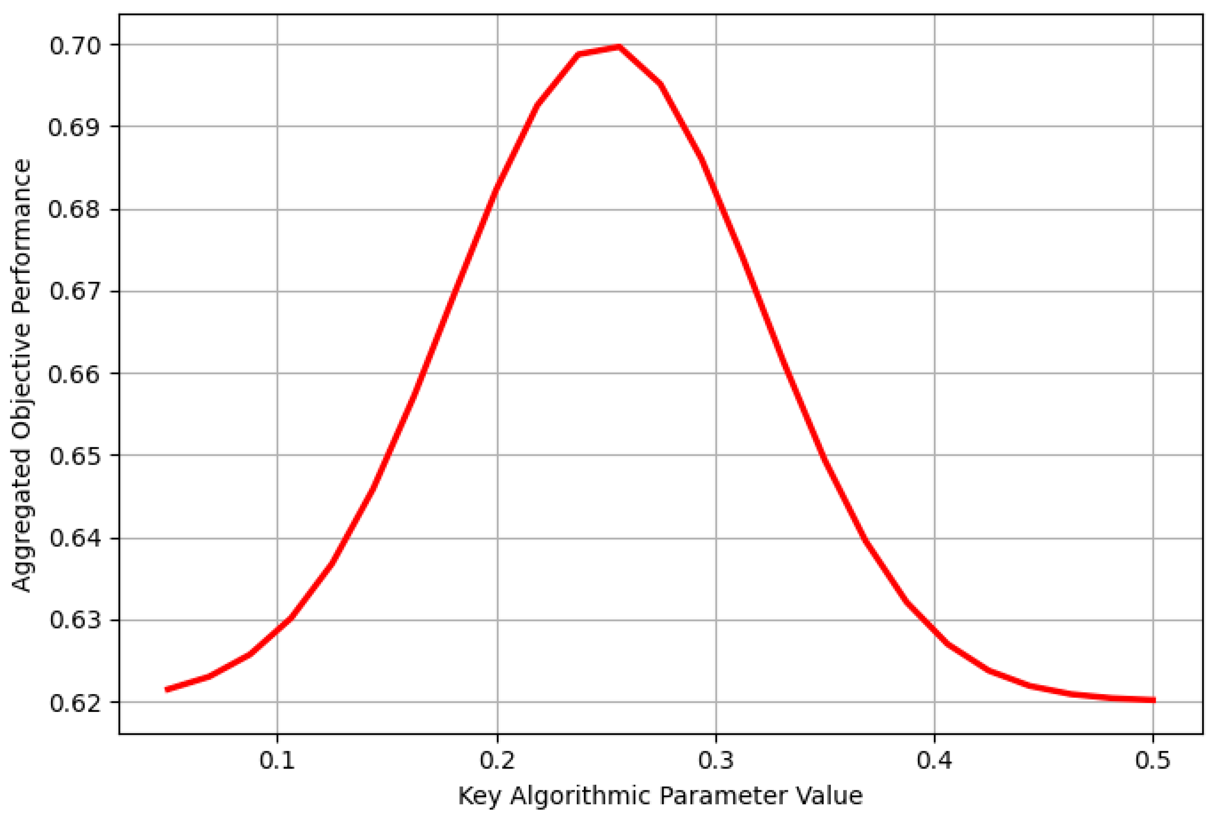Figure 6 shows the changes in the aggregated objective performance in response to changes in the value of the key algorithm parameter. This diagram examines the behavior of the system in a continuous range of parameter values and allows for a visual analysis of the sensitivity of the results.