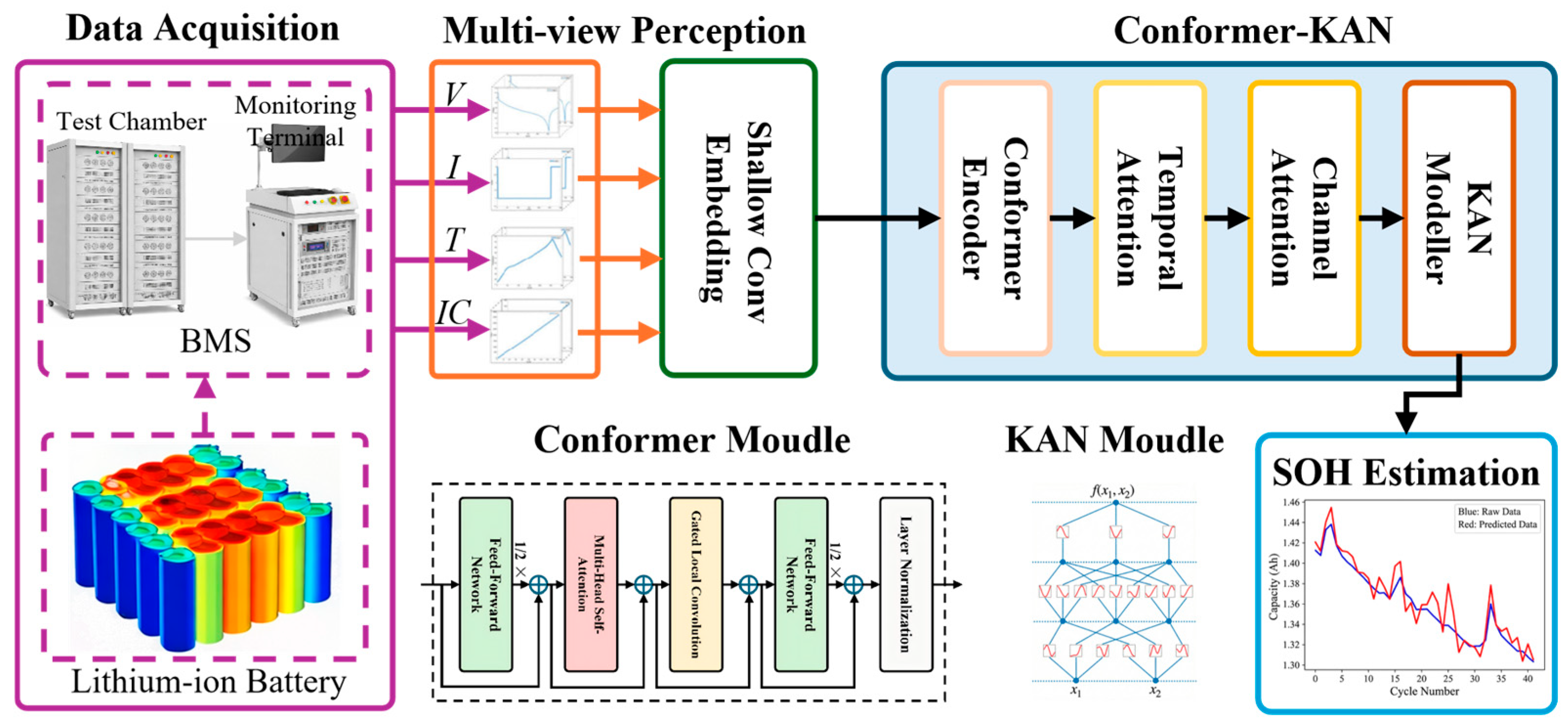 Collectively, despite continuous architectural advancements from feature-based regression to recurrent, attention-based, hybrid, and transfer-learning paradigms, existing methods still struggle to simultaneously achieve strong local feature sensitivity, effective long-range dependency modeling, high-capacity nonlinear function approximation, and robust cross-condition generalization within a unified framework. To address these limitations, this study proposes an end-to-end multi-view deep learning framework termed Conformer-KAN, which integrates a convolution-augmented Transformer (Conformer) with a Kolmogorov–Arnold Network (KAN) for SOH estimation. By incorporating convolutional inductive bias, attention-based global modeling, and spline-based adaptive nonlinear mapping into a single architecture, the proposed framework aims to improve both representational capacity and generalization robustness under complex operating conditions. The main contributions of this study are summarized as follows: