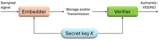 Our proposed improvement stores the fragile watermark in the LSBs of a signal’s samples. This signal could be, for example, an image, a sound, or a physical quantity sampled in time. Many works that embed data in the LSBs of samples have been published (see, for example, [8,14,15]). As already said, the developed algorithm works on sampled data and corrects a security flaw present in previously published papers [4,13]. Given that this problem is more evident on samples having a large bit depth, we implemented, tested, and compared our proposal mainly on audio files. In particular, we worked on non-compressed audio files (wave format) and evaluated the characteristics with respect to the works [8,16,17,18].