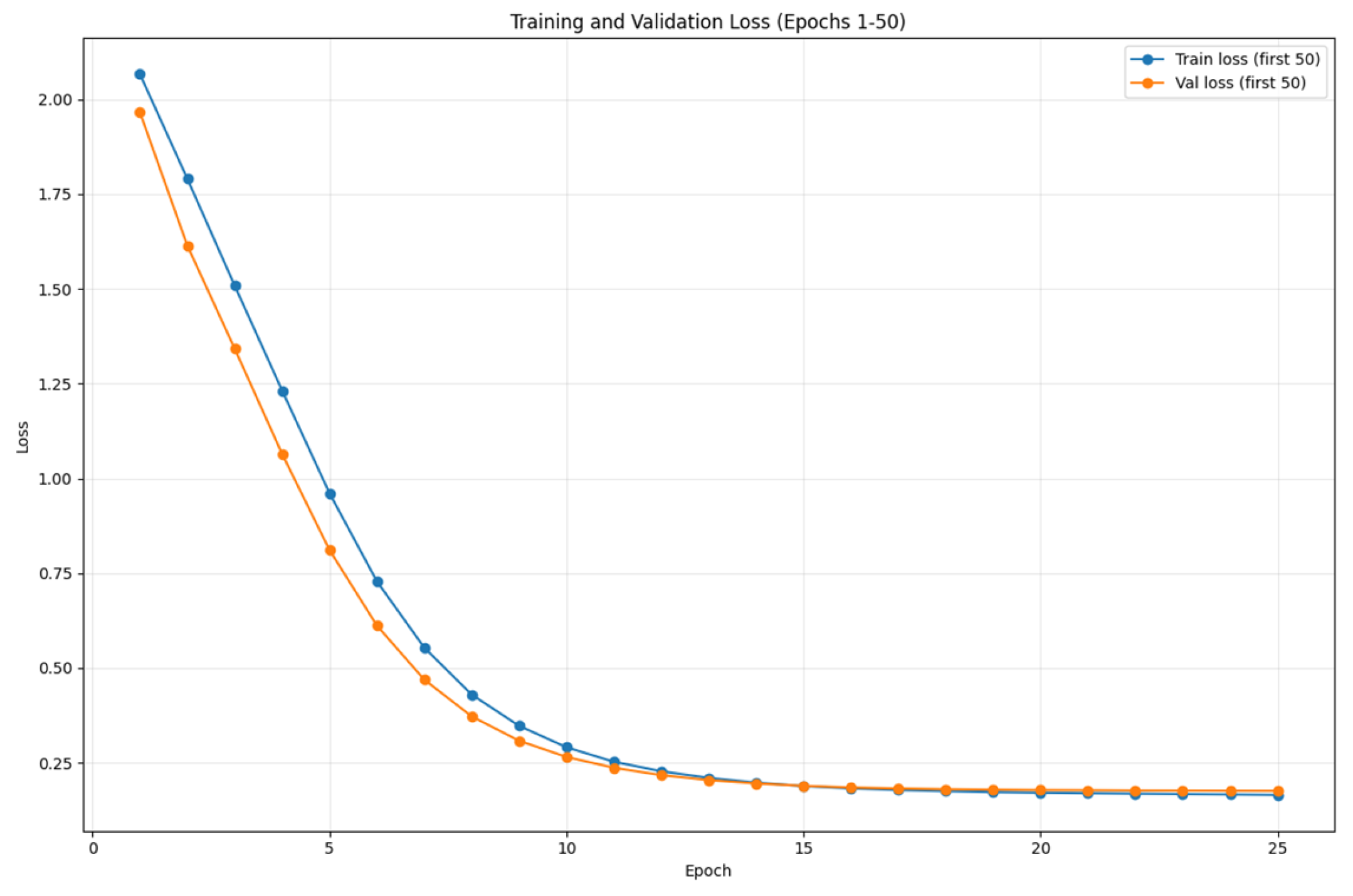 The curves converge closely until epoch 12, after which validation loss begins to plateau while training loss continues to decline. The minimum validation loss (0.19) occurs at epoch 15, which was selected as the optimal checkpoint under the early stopping criterion. Subsequent divergence indicates the onset of overfitting, validating the checkpoint selection procedure.