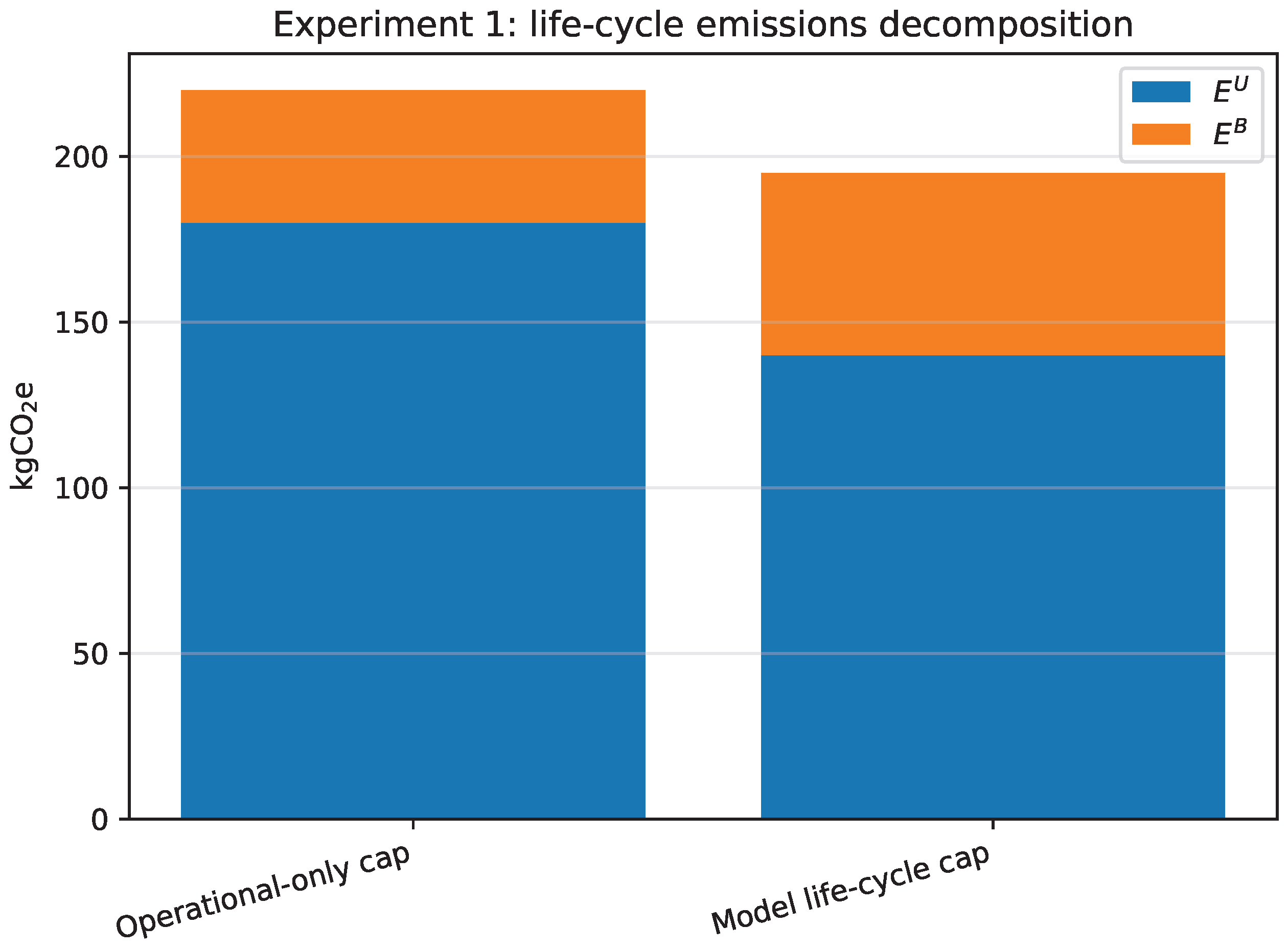 Experiment 1: decomposition of the achieved time-weighted life-cycle impacts into use-phase () and embodied () components for the two compared formulations.
