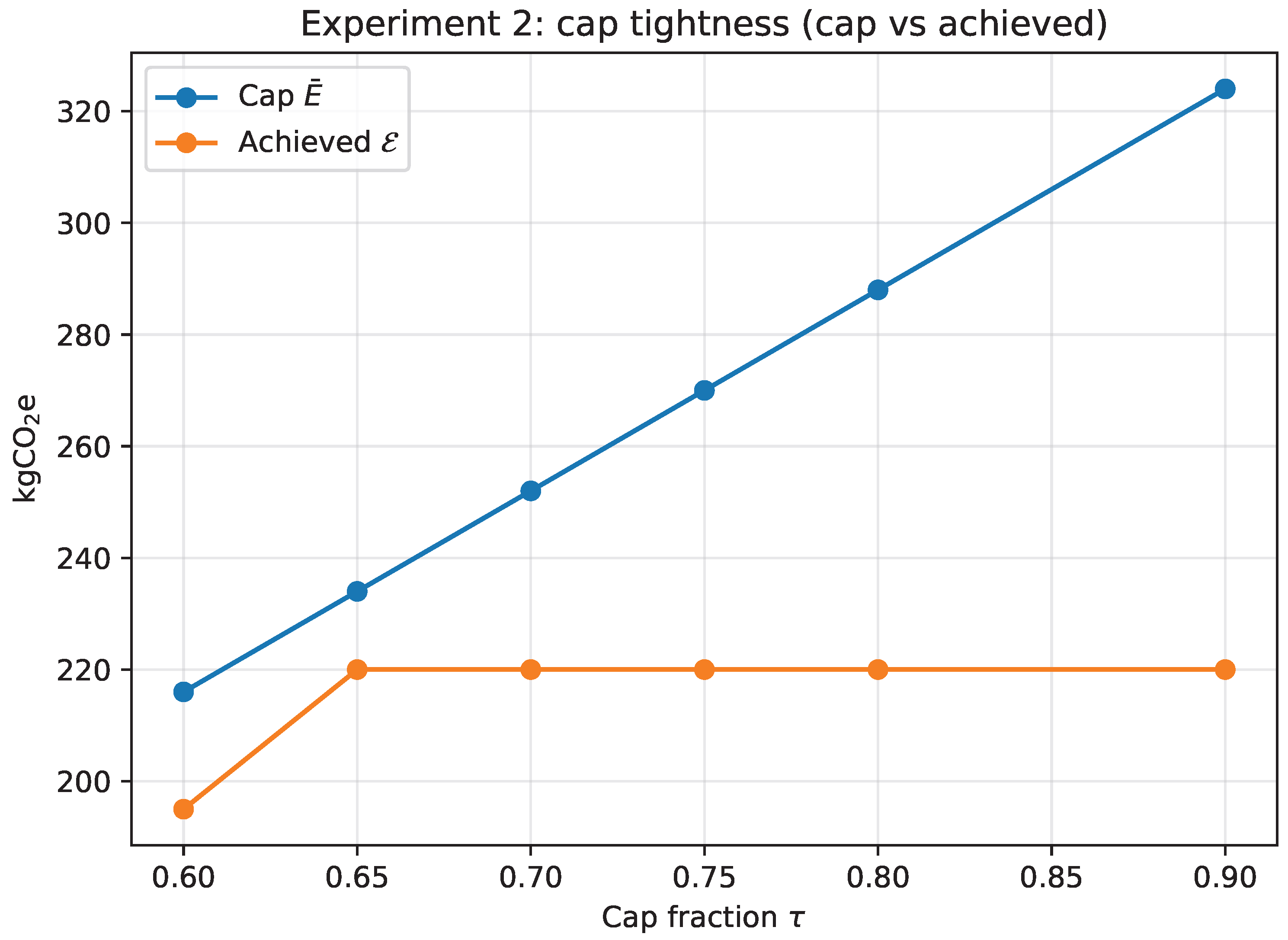 Experiment 2: cap tightness as the cap fraction varies. The cap is calibrated as and is compared to the achieved .