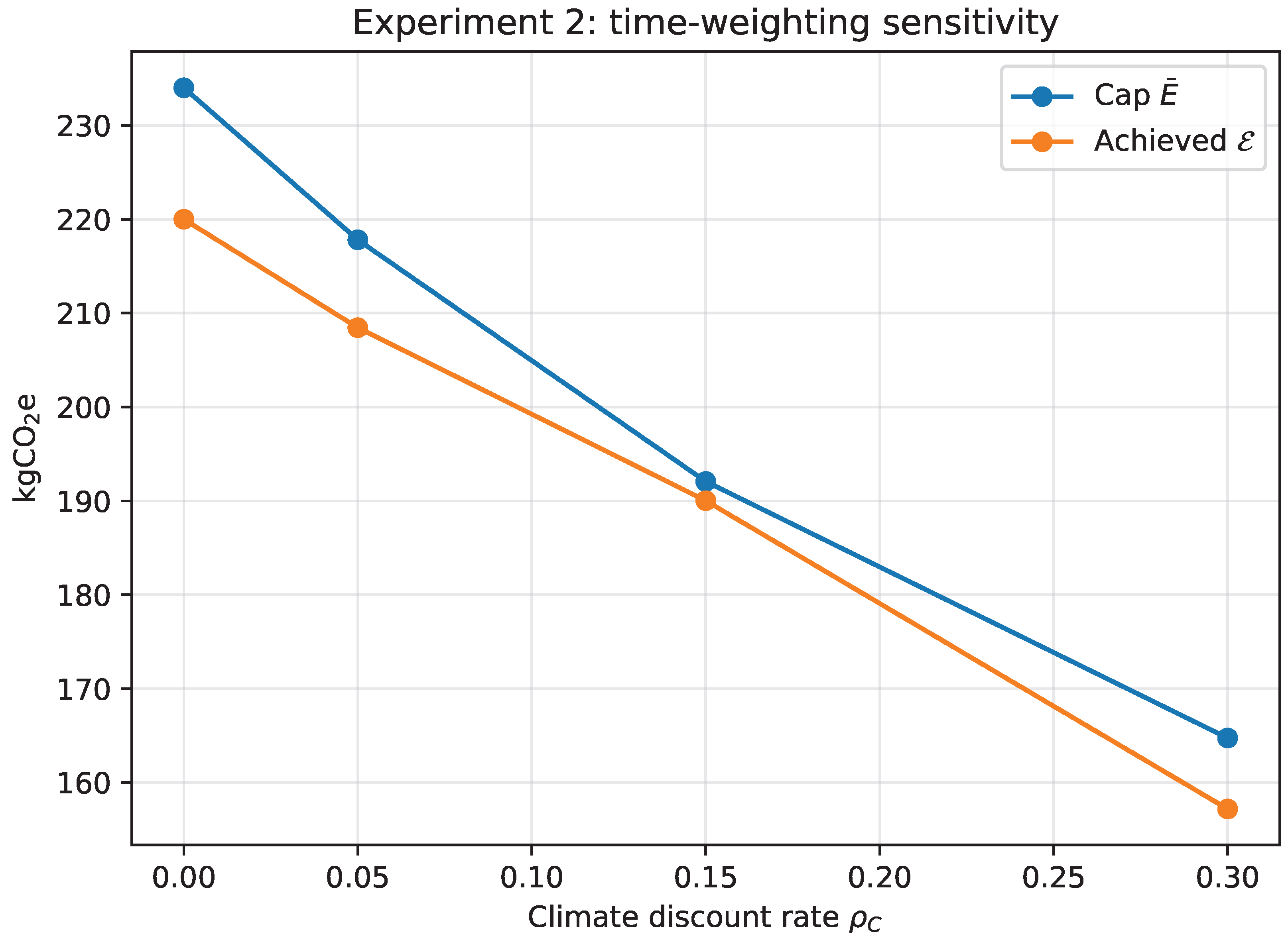 Experiment 2: sensitivity to time-weighting. For each , the cap is recalibrated as and compared to the achieved .