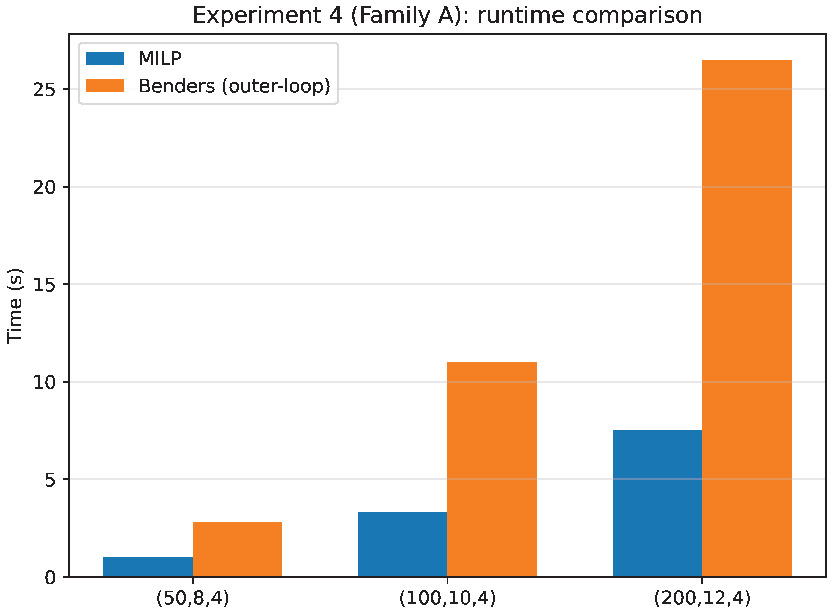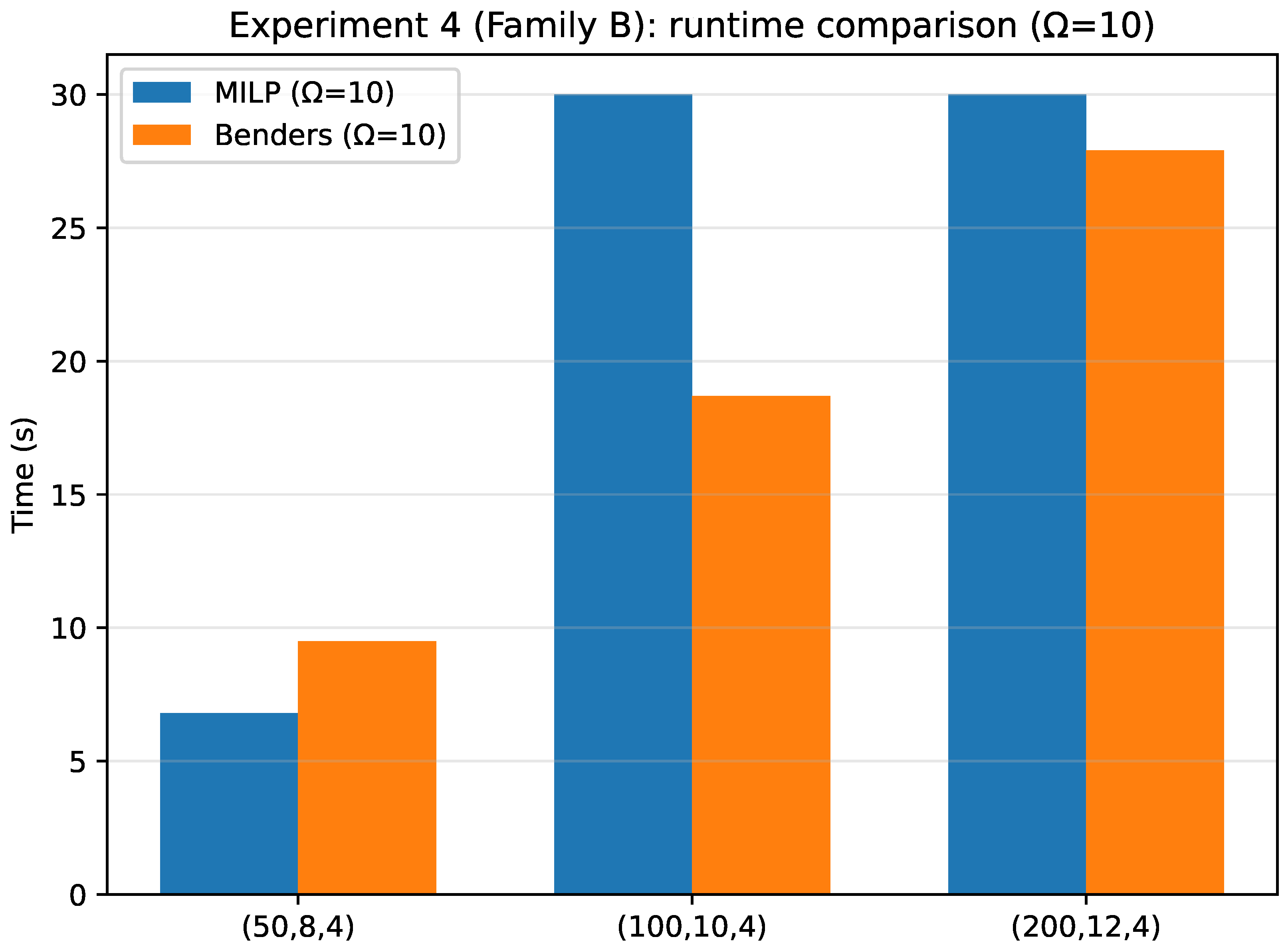 Experiment 4 (Family B, ): runtime comparison between the scenario-expanded monolithic MILP and the outer-loop Benders implementation.