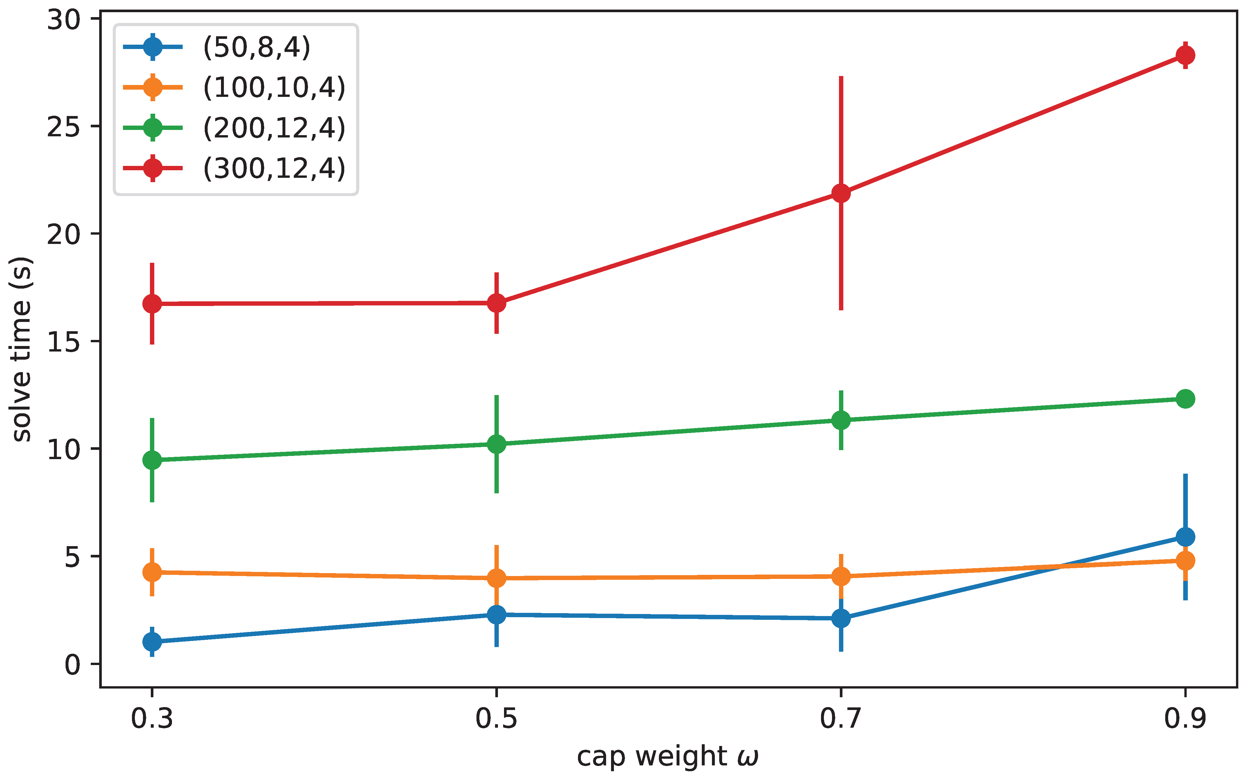 | (300, 12, 4) | 0.9 | 5 | 28.29 ± 0.63 | 343,117.6 ± 5355.9 | 414.8 ± 16.5 | 139,601.4 ± 2087.2 |
