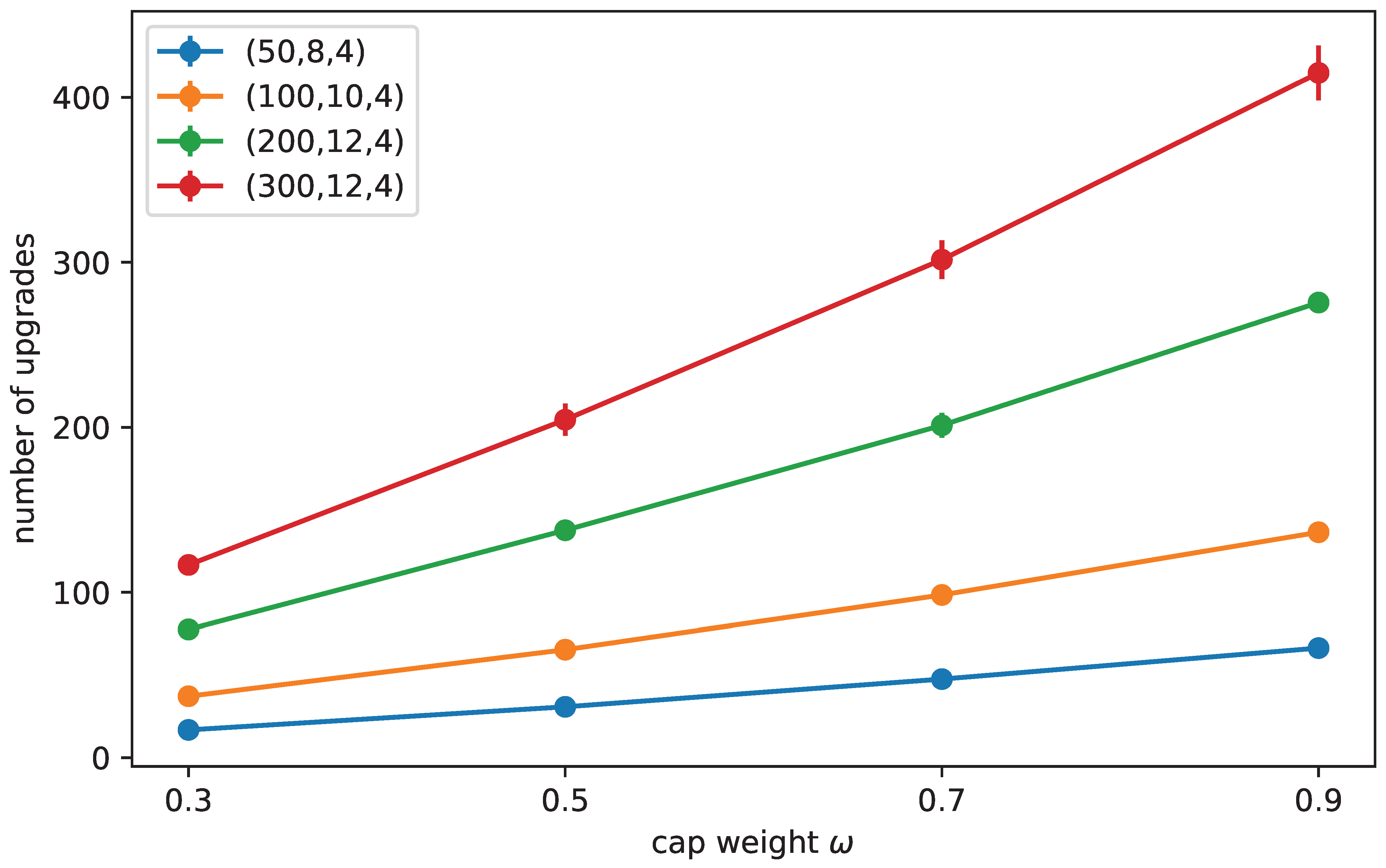 Family A cap-weight sensitivity: number of upgrades vs. (mean ± sd over 5 seeds).