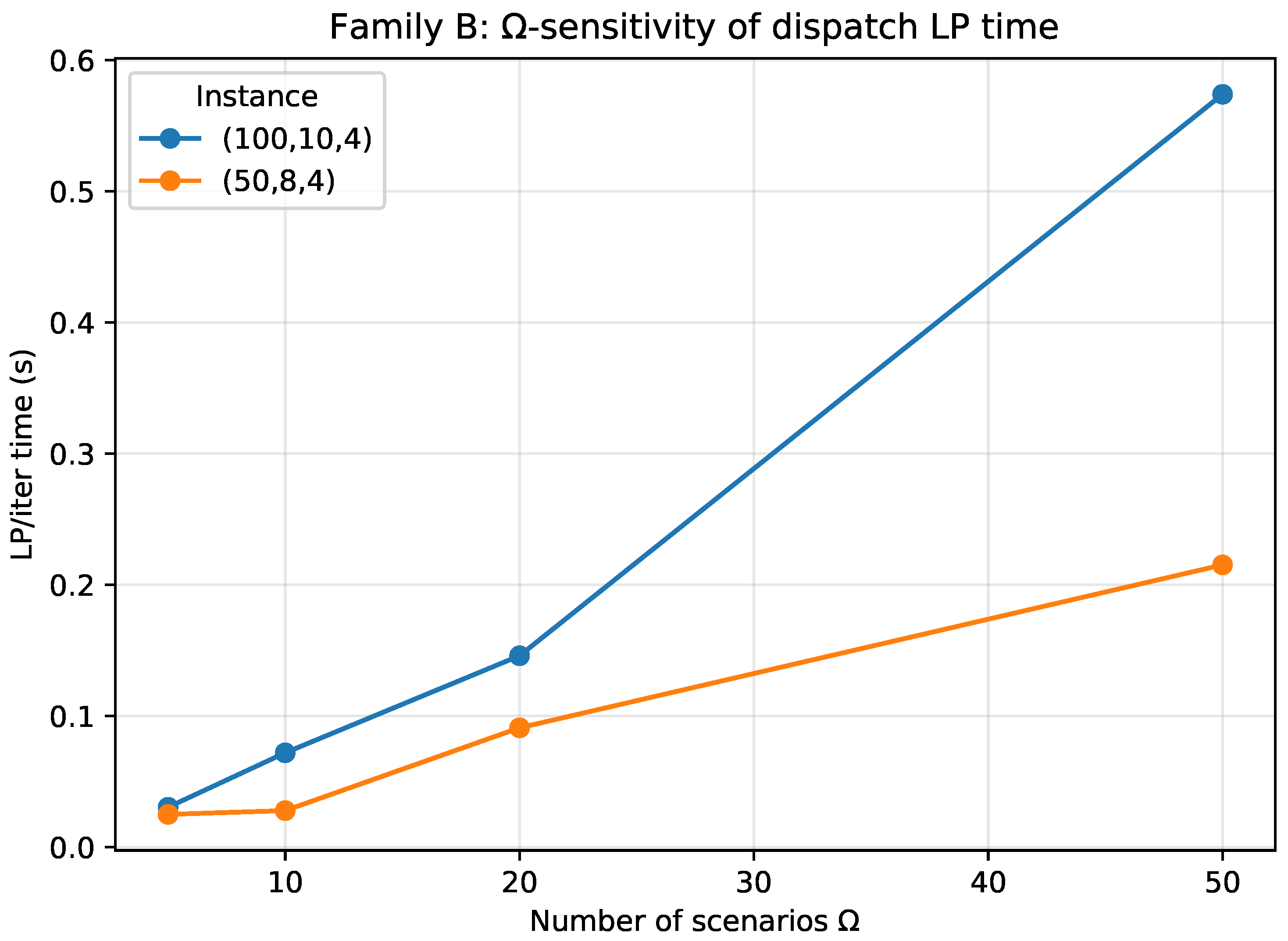 Family B: dispatch LP time per Benders iteration (LP/iter, build + solve) vs. number of scenarios . The master problem is independent of , so this curve captures the dominant -dependent component of the decomposition runtime.