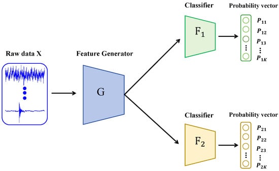 As shown in Figure 1, the architecture of the MCD model comprises a feature generator G and two classifiers, and , which share the same structure but are initialized differently. The generator G is responsible for mapping raw input data into a high-dimensional feature space, while the classifiers and are tasked with categorizing samples into K classes based on the extracted features.