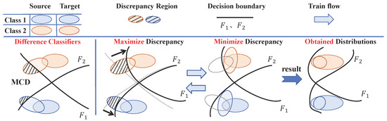 By alternately executing Step B and Step C, the model synergistically optimizes the feature extractor and classifiers to learn deep feature representations that possess both class discriminability and domain invariance, thereby enabling effective cross-domain fault diagnosis. The schematic principle of the MCD method is presented in Figure 2.