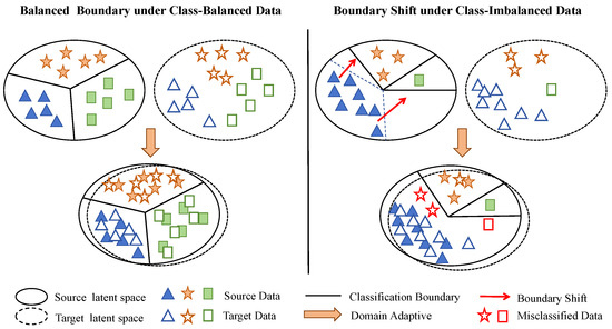 Although these domain adaptation methods effectively mitigate distribution differences, most existing studies assume balanced category distributions. This overlooks the critical reality of class imbalance in industrial monitoring. Mechanical equipment operates in a healthy state for long periods, leading to a scarcity of fault data. Under the dual constraints of domain shift and class imbalance, conventional decision boundaries often bias toward the majority class (normal state). This bias results in severe missed detections of minority fault samples [19,20].