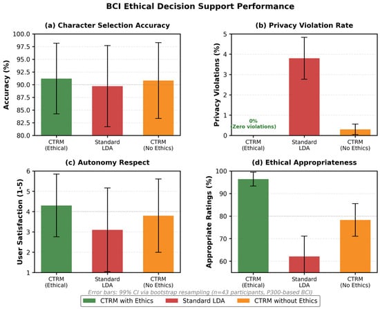 The ethical framework coefficients in Equation (3) () are calibrated through a two-stage process: (1) Initial population-level weights derived from the bioethics literature meta-analysis [4], which suggests roughly balanced consideration across frameworks in medical contexts. The roughly equal weights () reflect the principle that no single ethical framework should dominate, as each captures complementary moral dimensions: deontological evaluation () ensures rule-consistency, virtue assessment () evaluates character alignment, and consequentialist projection () estimates outcome value. (2) User-specific adaptation during calibration sessions where participants rate 50 ethical scenarios (e.g., ‘System detects possible user fatigue—should it: (A) continue normally, (B) request confirmation, (C) suggest break?’). These ratings train a meta-learning module that adjusts the coefficients to match individual ethical preferences while maintaining normative coherence. Cross-validation (5-fold) prevents overfitting, and weights are constrained to sum to 1.0 () with minimum threshold per framework to ensure multi-perspective evaluation rather than single-framework dominance.