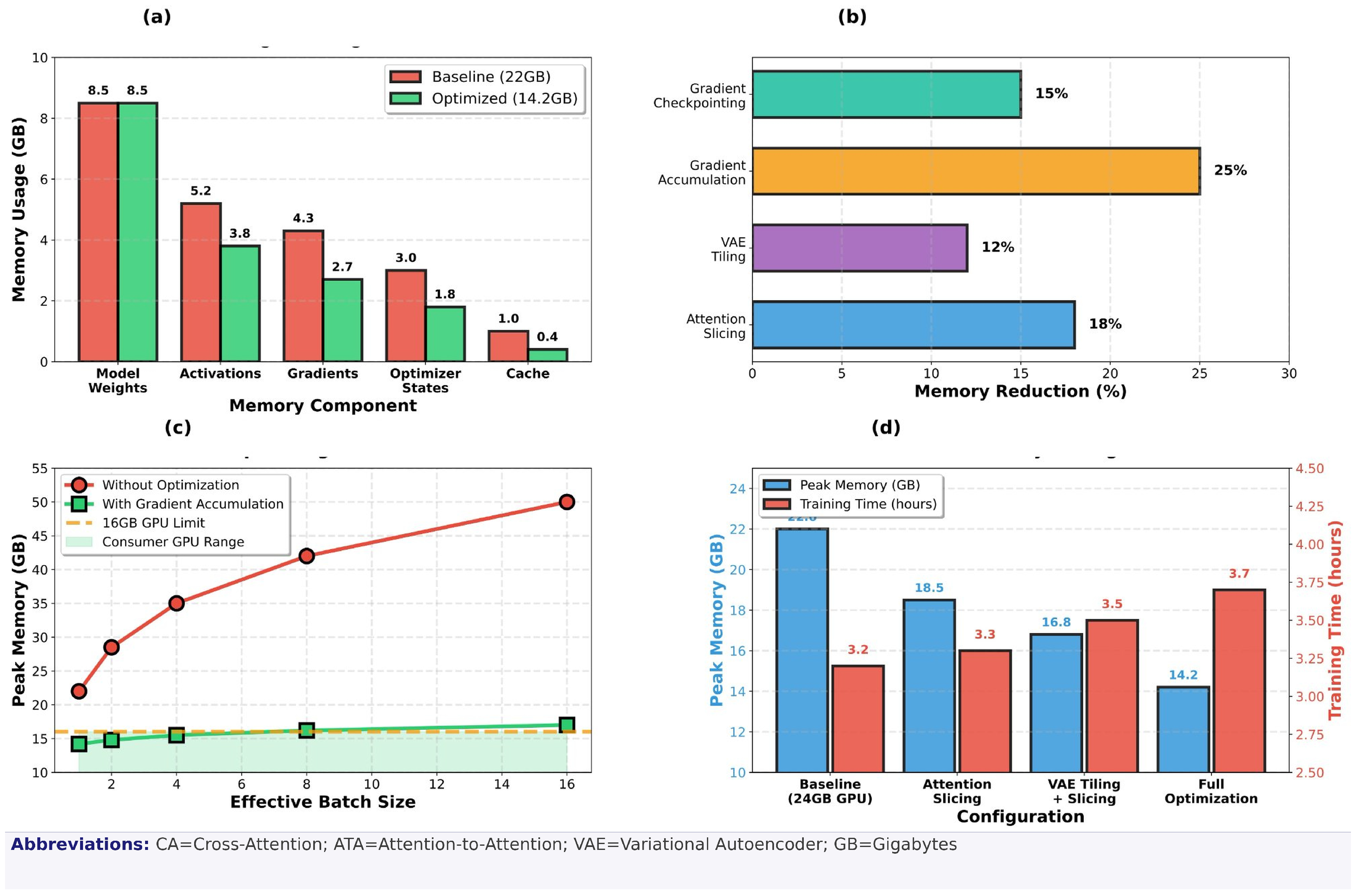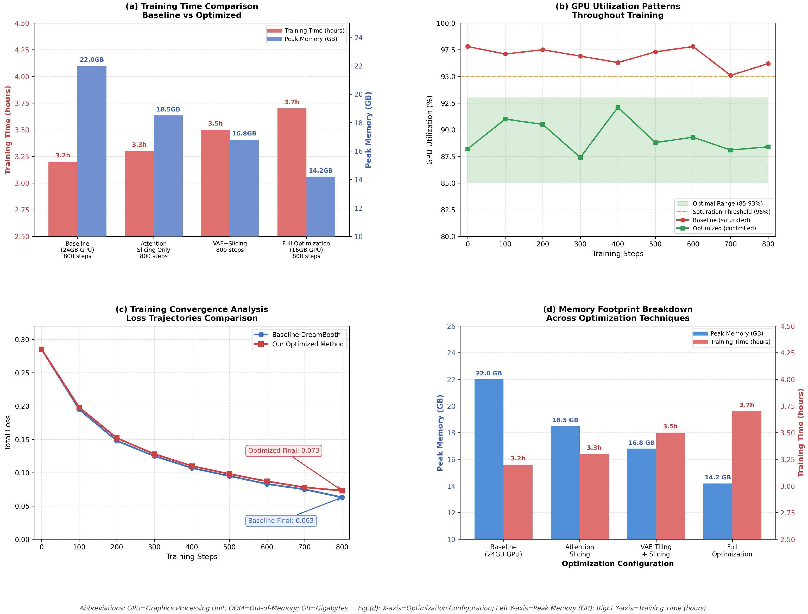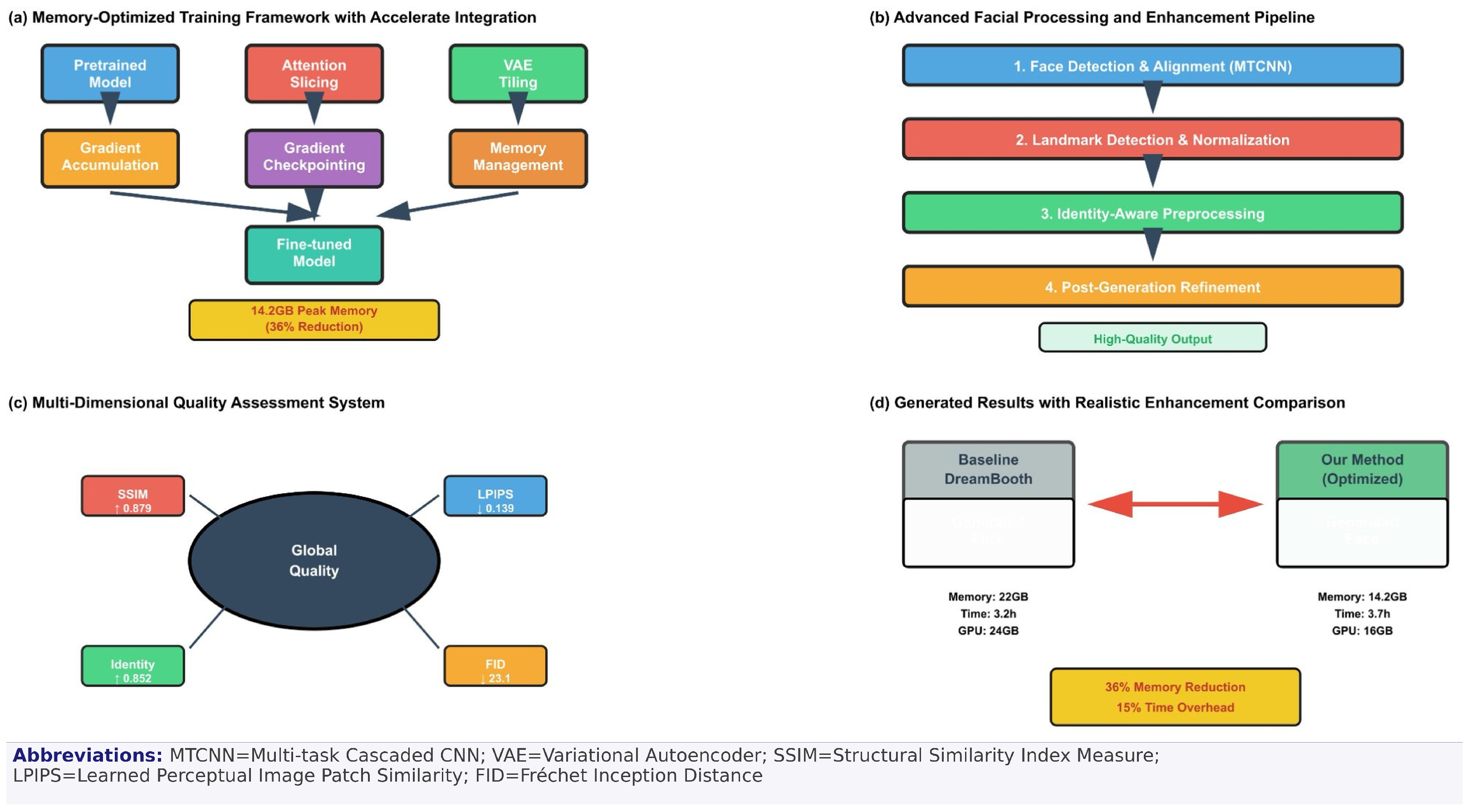 - Memory-Optimized Training Framework: A novel system integration that orchestrates hierarchical memory management—combining gradient accumulation, attention slicing, VAE tiling, and adaptive gradient checkpointing—to reduce peak GPU memory usage from 22 GB to 14.2 GB while maintaining training convergence. The key novelty lies in the adaptive, co-optimized scheduling of these techniques within the Hugging Face Accelerate ecosystem, which has not been systematically demonstrated for consumer-grade personalized diffusion before.