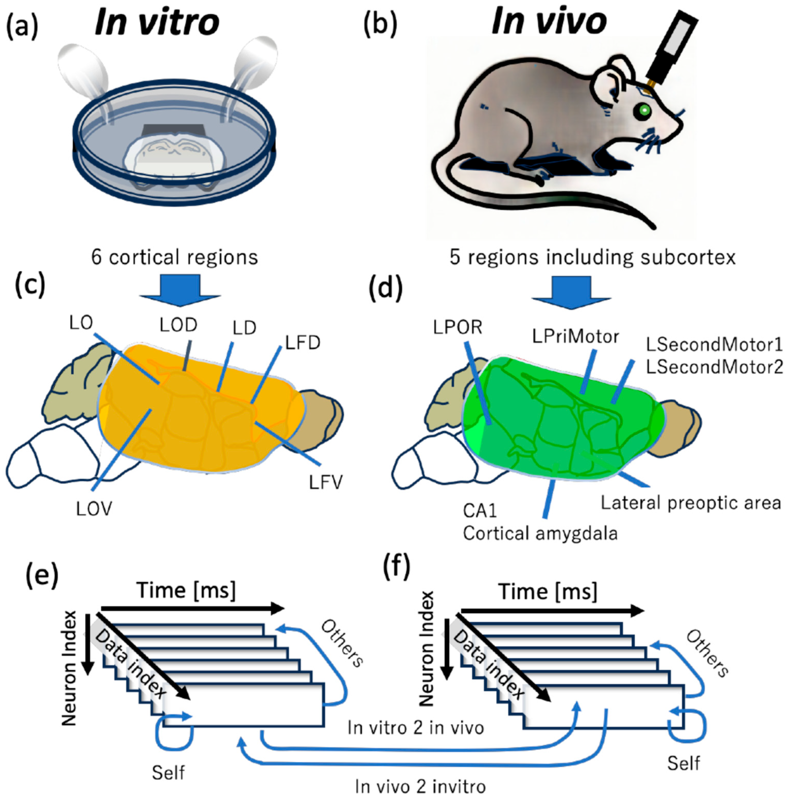 The in vitro data were obtained by the Shimono Lab, with recordings conducted from multiple regions of the left cerebral hemisphere. In contrast, the in vivo data were collected by the Dora Angelaki lab., Thomas Mrsic-Flogel lab., and Sonja Hofer lab, covering a wide range of brain regions, including the motor cortex, visual cortex, hippocampus, and amygdala.