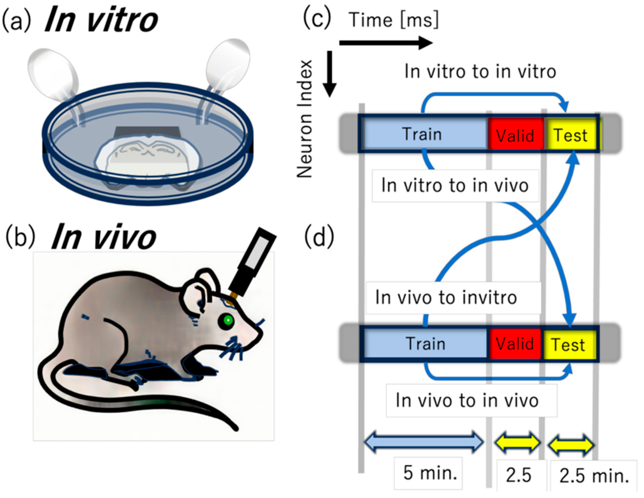 From a translational viewpoint, a central challenge is whether dynamical regularities learned under one recording preparation generalize to another. Compared with within-preparation settings emphasized in prior neural sequence modeling, transfer between in vitro and in vivo confronts a larger, compound shift: brain state and non-stationarity differ, noise and artifact structure (including spike-sorting biases) change, firing rates and sparsity regimes shift, and there is typically no neuron-to-neuron correspondence or paired trials to anchor the mapping. Nonetheless, in vitro preparations allow controlled manipulation and stable recording conditions, whereas in vivo recordings capture dynamics in an intact, behaving organism; quantifying links between these regimes could provide a reusable bridge for downstream analyses and inform coordinated experimental design [