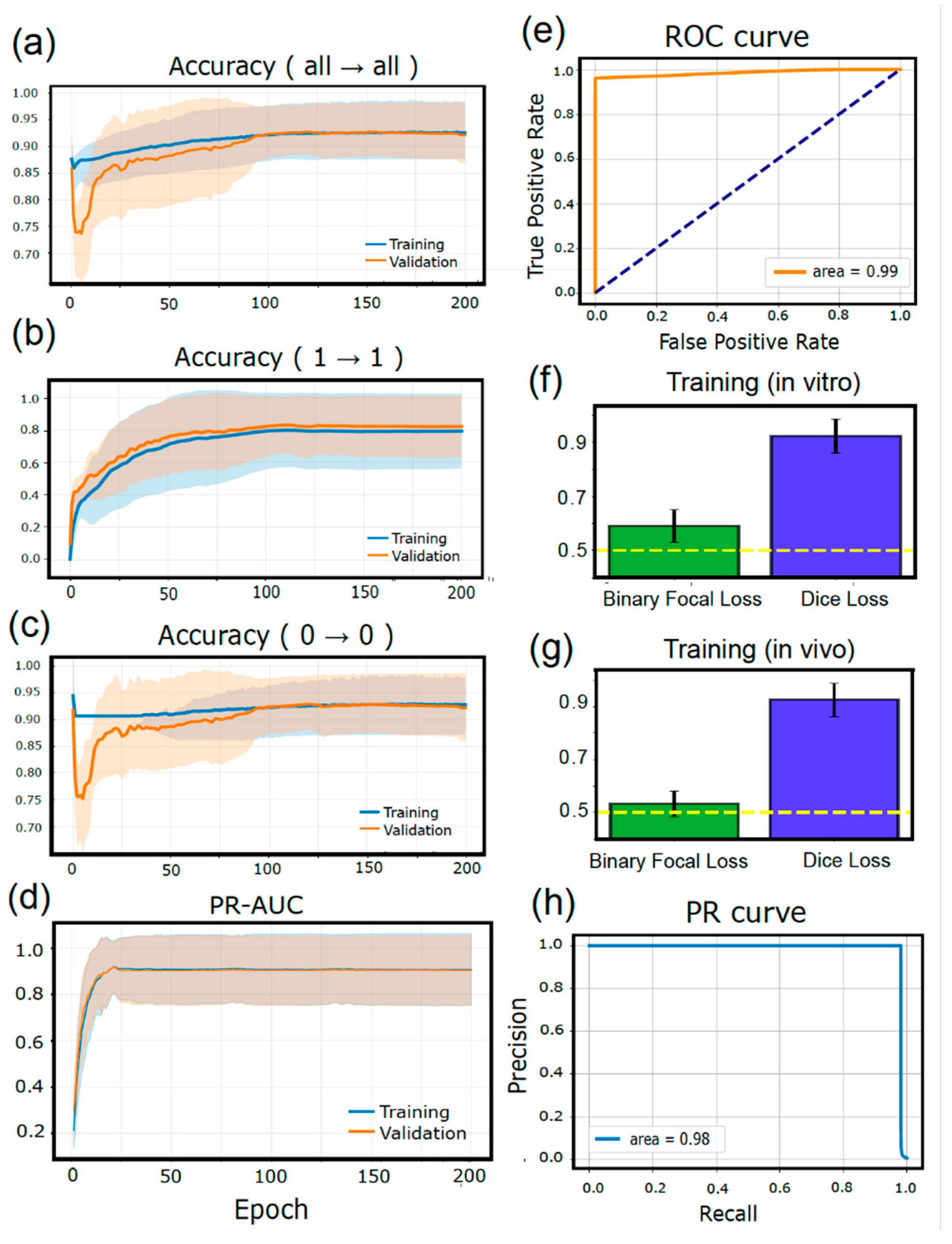 Figure 3). Because spike prediction is extremely class-imbalanced, we report ROC-AUC alongside Precision–Recall curves and PR-AUC, and we interpret PR-based metrics as the primary indicators of minority-event (spike) quality under extreme sparsity; ROC-AUC is retained to summarize ranking performance. During training, the true-positive and true-negative rates approached ~90% on average, but these values should be interpreted in the context of ROC/PR metrics. This high level of accuracy was difficult to achieve with alternative loss functions beyond the use of Dice loss. Moreover, the spike (1) accuracy and PR-AUC also reached very high levels, supporting that minority-event (spike) detection improved beyond what ROC-AUC alone indicates.