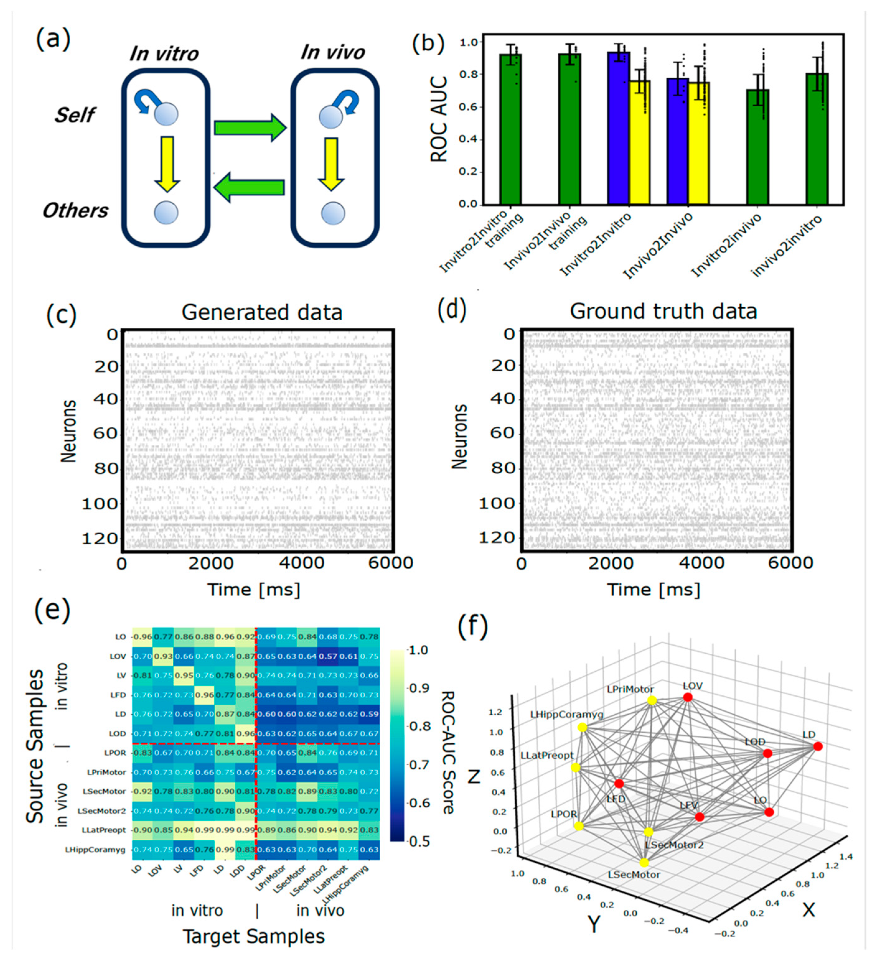 Figure 4f. This mapping clearly captures the expected spatial relationships among data points in multiple aspects. For instance, the two data points measured from the secondary motor cortex are closely aligned and surrounded by data points associated with the motor cortex both in the in vitro and in vivo data. Additionally, the in vivo and in vitro data are spatially separated into two distinct clusters on the left and right. These semantically meaningful embeddings represent the relative relationships between data points, suggesting how activity transitions from one data point to another. In this study, we demonstrate cross-generation from brief spontaneous activity in both traditional in vitro data and the in vivo data provided by the International Brain Laboratory. Choosing the optimal embedding dimensionality is always a challenging problem. If one spatially maps neural-activity similarity by directly comparing it to actual spatial distances, both in vitro and in vivo points would naturally lie in a three-dimensional space. Hence, embedding the two datasets (in vitro and in vivo) in three to four dimensions is reasonably justified for their comparison in this work. However, should the number of datasets under comparison grow to three, four, five, or more, new justifications will be required to determine whether a three-dimensional visualization remains appropriate.
