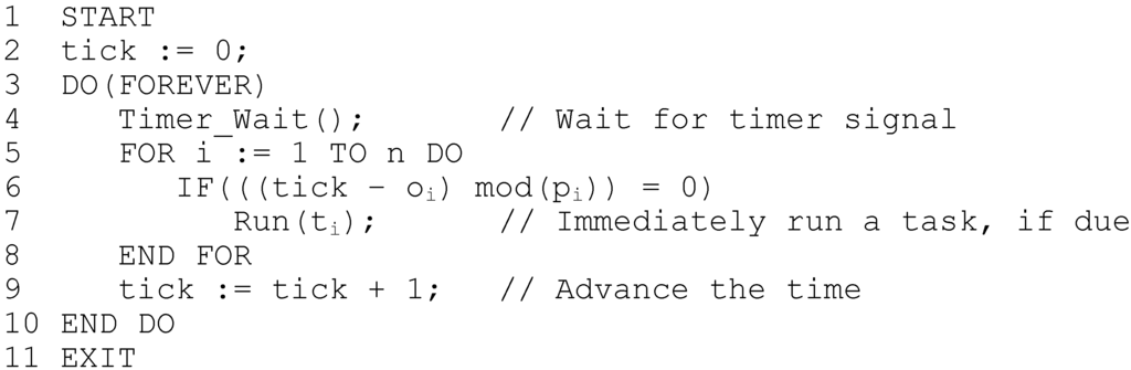 To overcome this limitation, the non-preemptive ‘thrift’ scheduler (or ‘TTC’ scheduler) has been proposed []. This scheduling algorithm does not allow the use of inserted idle-time, and essentially maintains a system of congruences to replace the lookup table, and is presented in pseudo code in Figure 1. As can be seen, when tasks are released by the scheduler, they are immediately dispatched on a first-come, first-served basis (FCFS). In general, generating a feasible schedule for a thrift scheduler reduces to assigning offsets (delays) to each task [,], resulting in an asynchronous schedule. However, previous investigations into the complexity of deciding the feasibility of asynchronous schedules have shown it to be a strongly coNP-Complete problem, at least in the case of the preemptive schedulers []. Moreover, as Goossens [] has commented, when attempting to assign offsets to preemptively schedule a task set, that there seems to be no way to avoid enumerating and searching an exponential amount of offset combinations; in fact the decision version of this particular problem is known to be complete for Σ2p, even when preemption is allowed []. Unsurprisingly, similar results have been demonstrated for the non-preemptive thrift cyclic scheduler, in which certain task parameters are allowed to be either integer or fractional [,].