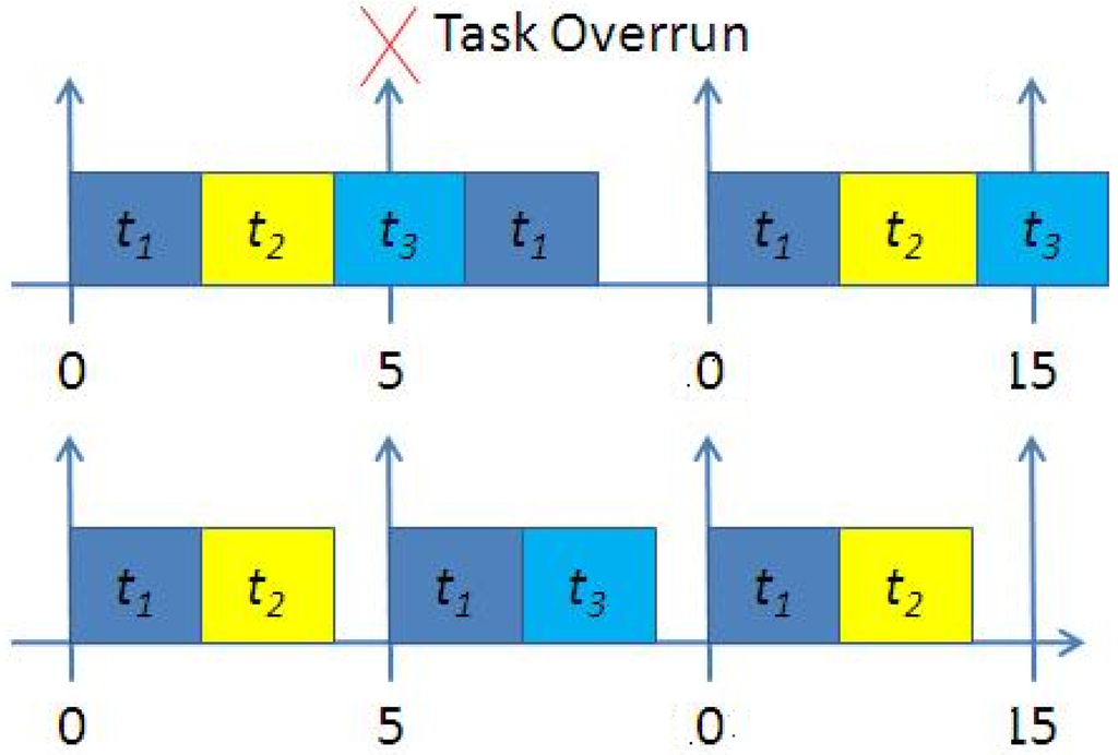 Effect of task release times on feasibility, showing (top): a synchronous infeasible task set with τ = {(5,2),(10,2),(10,2)}; (bottom): an asynchronous (feasible) version of this task set with release time of 1 tick – 5 time units - added to t3.