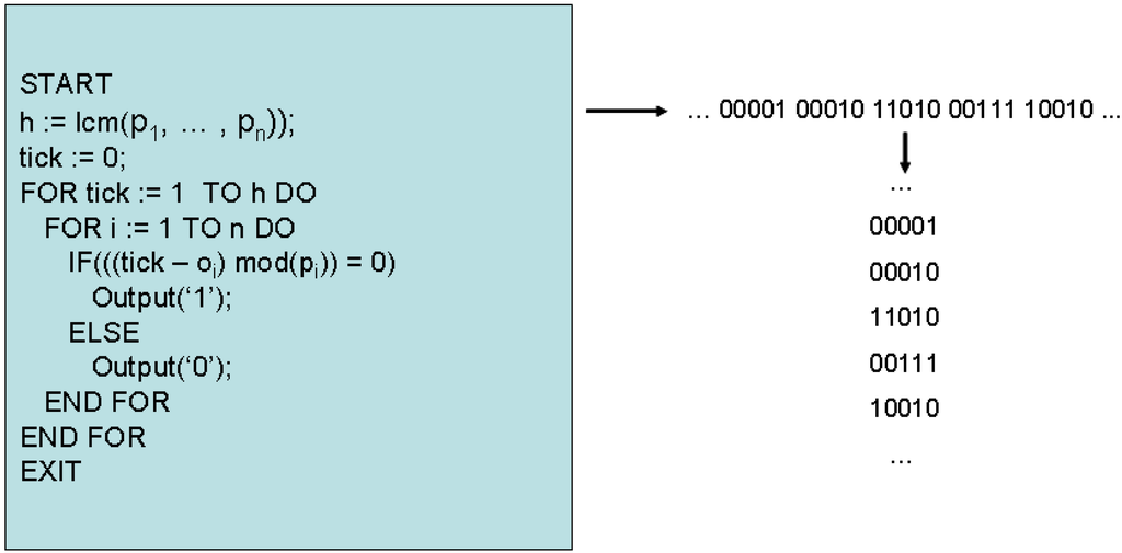In such an abstraction, the demand for processor time η at each tick interval relates to this binary sequence as follows. The processor demand at the kth tick interval is determined by simply weighting the ith binary digit in the kth n-bit sequence by the ith task’s execution time, ci, then summing the weighted totals. To observe the worst-case behavior of a given schedule, it follows from Theorem 1 and Equation (7) that h n-bit long binary sequences must be examined. In general, from (7), it can be observed that from the numerical properties of least common multiple, in the worst-case h is proportional to the product of the task set periods (this situation occurs when all periods are pairwise coprime). If the maximum of the task set periods is represented by the parameter pmax, it follows that the running time of a hyperperiod simulation algorithm is given by O(n pmaxn). It can also be observed that in the best case—for instance when all task periods are restricted to be integer powers of 2 (2, 4, 8, 16, 32 … etc.)—h is simply proportional to pmax; the best one can hope for is that the algorithm running time is pseudo-polynomial in the input parameters.