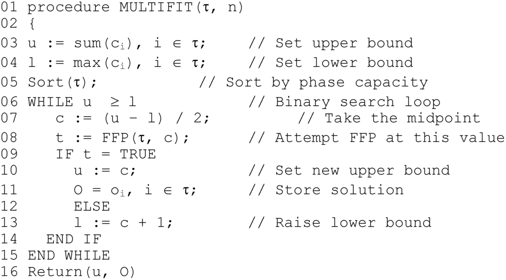 In [], the authors suggest a basic heuristic for offset assignment, achieved by sorting the list by non-decreasing period before application of a basic First-Fit (FF) algorithm under the assumption that each successive task is ‘easier’ to fit around the previous tasks. Given the analysis of the previous Section, it is clear that a better option would be to order the tasks by non-decreasing harmonic period; this leads to the First-Fit-Phase (FFP) algorithm. FFP first performs such a sort, then each task is assigned—one by one—the lowest indexed offset that will schedule it, until either all task are scheduled (returning TRUE) or one or more tasks couldn’t be scheduled (returning FALSE). The LCS algorithm is used for the feasibility test, and to reduce the search space only offsets bounded by each tasks phase capacity p’ are considered. The MULTIFIT algorithm proposed in this paper uses FPP as a key component in a binary search; MULTIFIT for the classical multiprocessor scheduling problem was originally proposed in [], and it has been proven that the resulting makespan can be no further than 22% away from the optimal makespan. The modified algorithm considered in this paper is very similar; a binary search is performed to find the minimum value of α such that applying FFP schedules the task set. Since FFP (and hence LCS) are called multiple times, the gcd’s of each pair of tasks are computed once only and stored in an array, and sorting is performed once only. The initial upper bound is set to the sum of tasks execution times, and the lower to the largest execution time in the task set. The MULTIFIT algorithm proposed in this paper is shown in Figure 6.