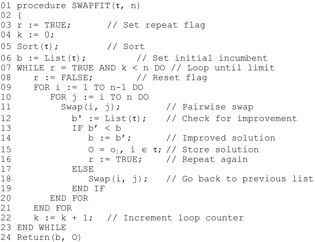 The LPT algorithm for multiprocessor scheduling first sorts the tasks in order of decreasing execution time, and assigns the tasks one by one onto the first available processor; the latter operation is known as list processing. It has been proven that the makespan resulting from LPT is no further than 33% from optimal. The rationale behind SWAPFIT is simple; there is a permutation of the tasks such that application of list processing produces an optimal makespan, and in [], it is shown that the list produced by sorting for non-increasing execution times produces a permutation that is very close to optimal. Starting from a good, initial solution, an attempt is made to sort the list into a better order, guided by resulting changes in the value of the objective function. In the SWAPFIT algorithm, list processing is modified as follows; each task in the list is assigned, one by one, an offset (bounded by p’) that minimizes the worst-case release of the task. LPT is initially employed to obtain a starting solution. Next, every pairwise set of tasks in the list is reversed, one by one; if such a reverse causes the objective function to decrease when the tasks are list processed, it is accepted. If not, the change is rejected, and the tasks swapped back. The SWAPFIT algorithm is shown in Figure 7.