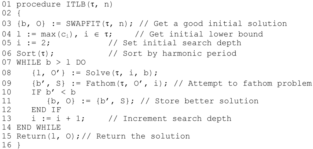 The ITLB algorithm builds from the fact that in any schedule, there is a task ‘bottleneck’ that defines the optimal value achievable for the problem instance. This bottleneck is most likely to be between tasks whose pairwise gcd’s are low; for example, a subset of tasks with co-prime periods. The ITLB algorithm works as follows; an initial incumbent solution b is found using SWAPFIT, and the tasks are then sorted according to non-decreasing harmonic period; tasks with low harmonic period are the most difficult to separate. Then, starting with low i, the first i tasks are solved to optimality, with backstepping guided by b. The optimal value l found by this process constitutes a lower bound on z; as the number of tasks is increased above i, it is clear to see that l cannot possibly decrease. Given the bound l, and a set of offsets O’ for the first i tasks, the algorithm then attempts to schedule the remaining n-i tasks using SWAPFIT, such that the optimal value does not increase. If this can be achieved, then a provably optimal schedule has been found; if it cannot, i is incremented to deepen the search, and b and l are updated if a better solution or tighter lower bound have been found, and the process repeated. The ITLB algorithm is shown in Figure 8.