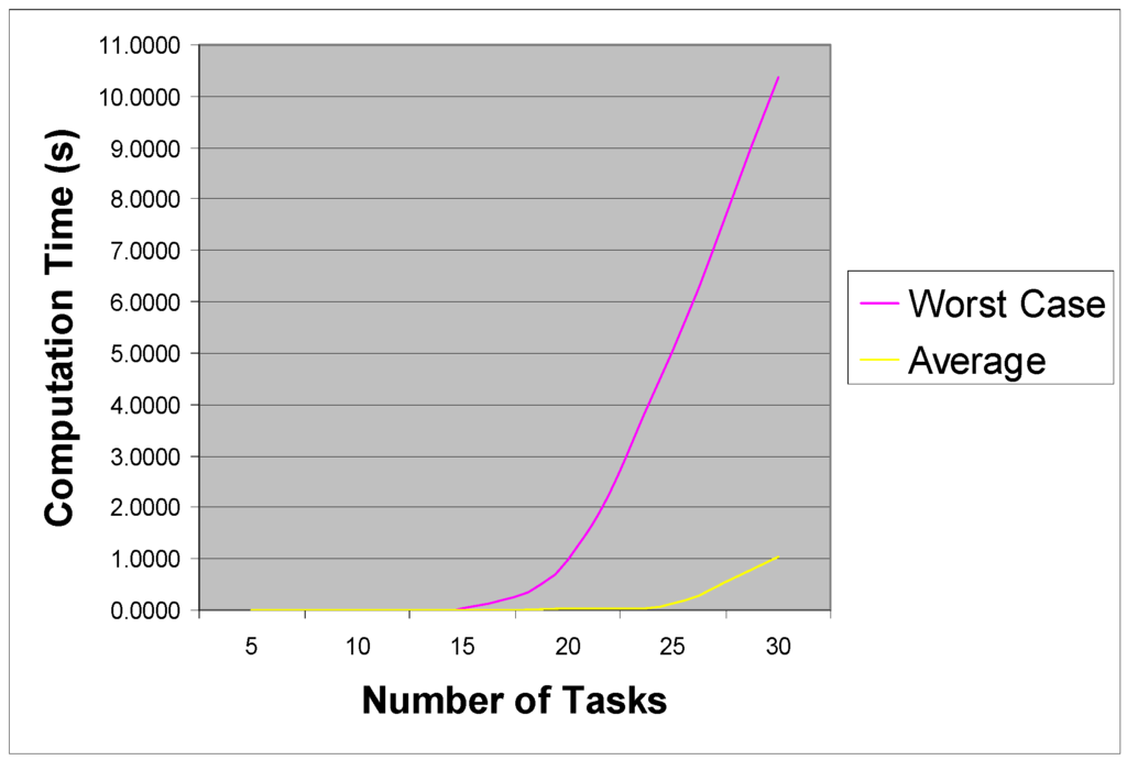 It can be seen from Table 1 that in all cases, the LCS method was significantly faster than basic hyperperiod simulation for solving TSASP. As can be seen from the results, LCS is extremely robust in terms of the task parameters; in comparison, hyperperiod simulation sees huge fluctuations in computation time as the task parameters vary, in some cases taking in excess of 16 minutes to solve these vastly restricted instances. Considering now the results of Table 2, it can be seen that as the number of tasks increases, the worst case computation time reflects the exponential in n; however, even given this complexity rise the worst case recorded for n = 30 was under 400 µs. It should be noted that reduced hyperperiod simulation (as outlined in Section 4.1) was employed on average less than 1% of the time. Despite this exponential rise, the LCS algorithm in its current formulation is still extremely efficient at this level, and gives a huge gain in efficiency over basic hyperperiod simulation. For example, with n = 30 and periods in the range 1–1,000 ms, out of 100 randomly generated instances, not a single one could be solved in under 1 hrs computation time. Extrapolating the results from Table 1—using the calculated length of h—indicated that most would take around 1070 Centuries to solve.