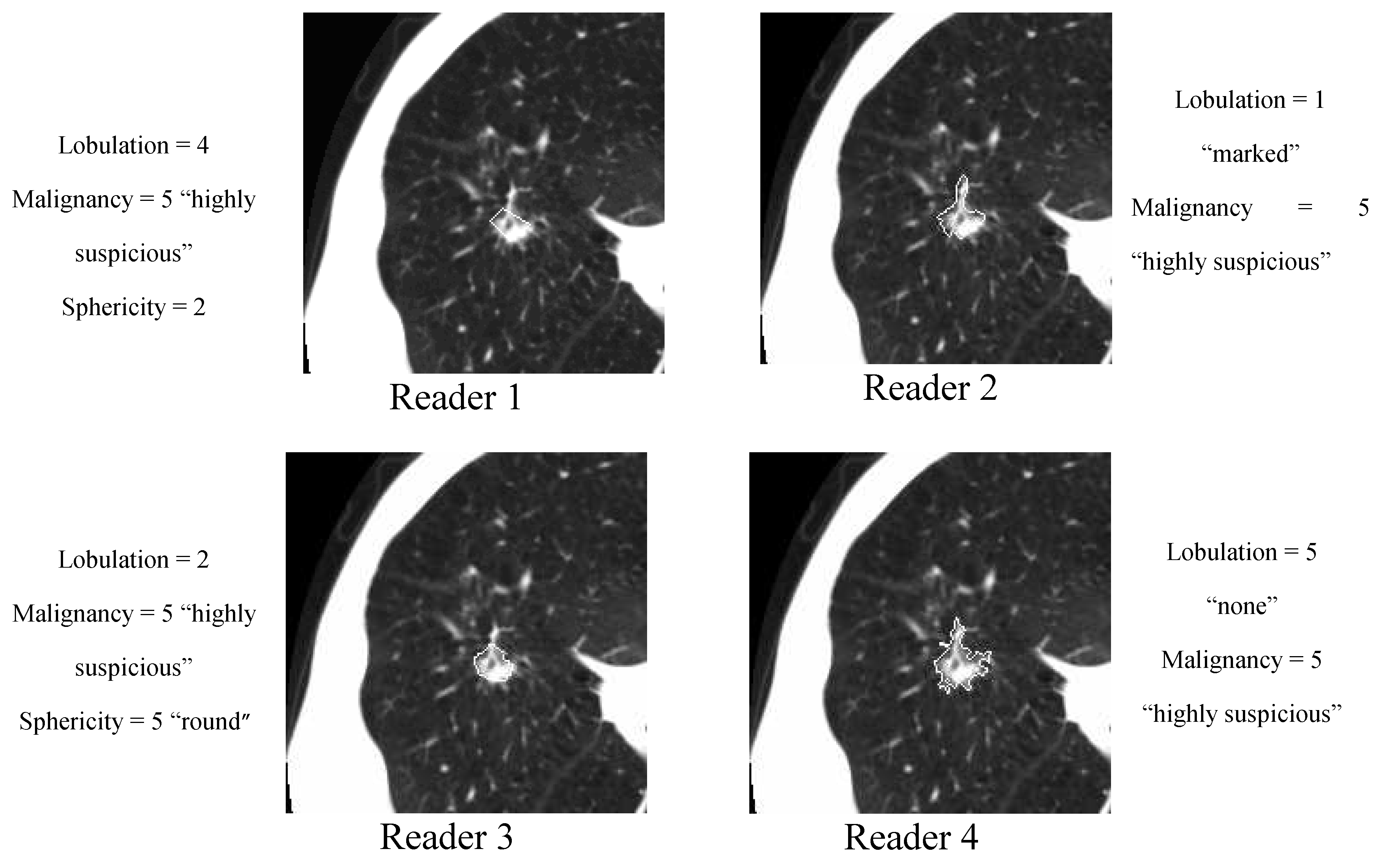 The nodule outlines and the seven of the nodule characteristics were used extensively throughout this study. Note that the LIDC did not impose a forced consensus; rather, all of the lesions indicated by the radiologists at the conclusion of the unblinded reading sessions were recorded and are available to users of the database. Accordingly, each lesion in the database considered to be a nodule > 3 mm could have been marked as such by only a single radiologist, by two radiologists, by three radiologists, or by all four LIDC radiologists. For any given nodule, the number of distinct outlines and the number of sets of nodule characteristic ratings provided in the XML files would then be equal to the number of radiologists who identified the nodule.