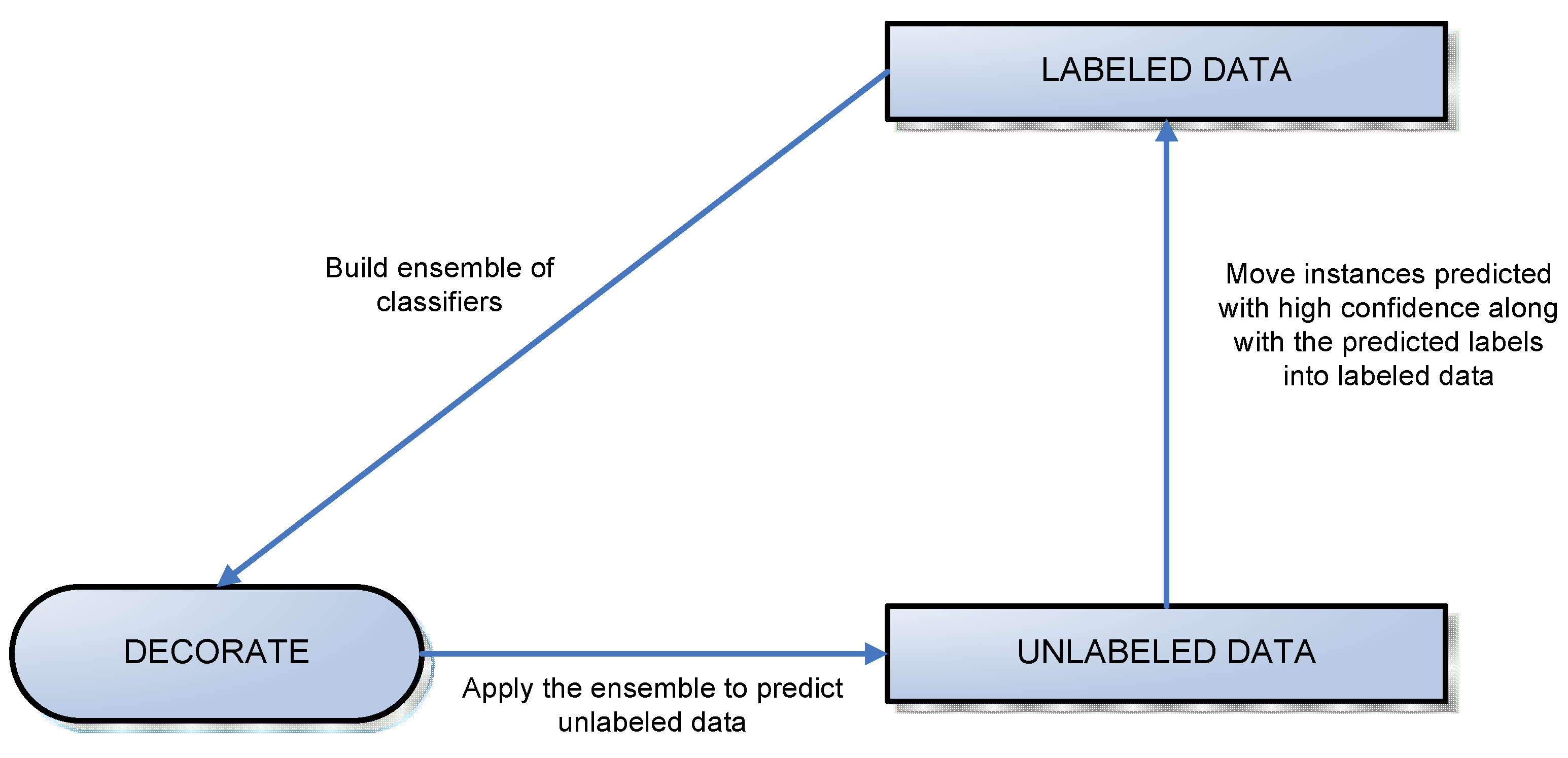 Not surprisingly, when tested on a set of data that had never been viewed, both the single decision tree and our ensemble produced lower accuracies. However, one of the main features of the Active-DECORATE algorithm is its ability to dynamically adjust the ensemble when fed with newly available instances. In other words, the ensemble will not be generated just once, and then used in immutable form for classification of every new instance, but rather learn from every new instance it classifies, every time modifying the classification rules accordingly. Furthermore, associating different costs to different types of misclassifications (for example, misclassifying an instance as 3 when it is actually a 1 will receive a higher cost than when misclassifying it as 2 and a lower cost than when classifying it as 4), improves the results on the evaluation dataset by more than 20% (