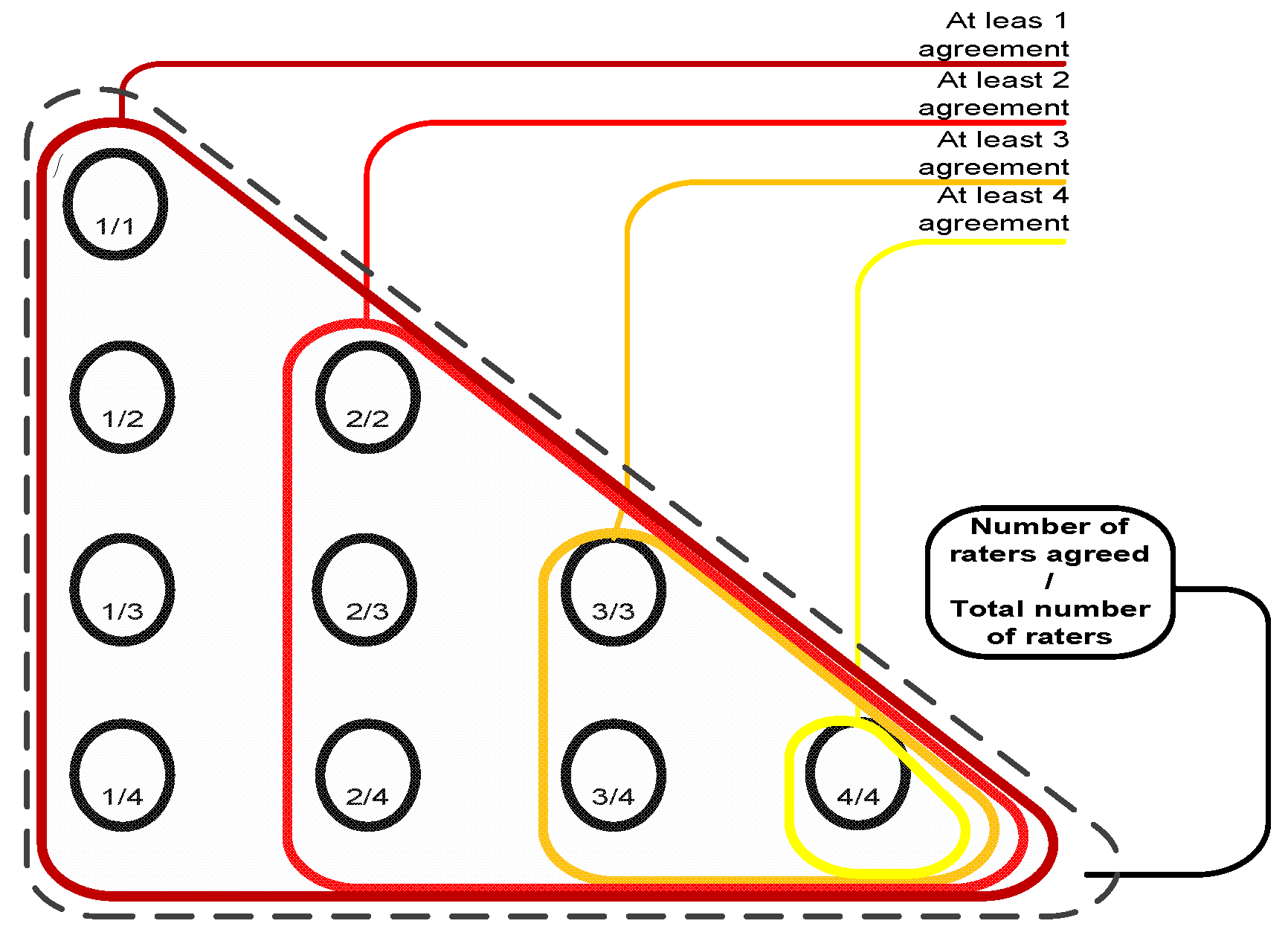 | Agreement level | At least 3 | At least 2 | At least 1 |