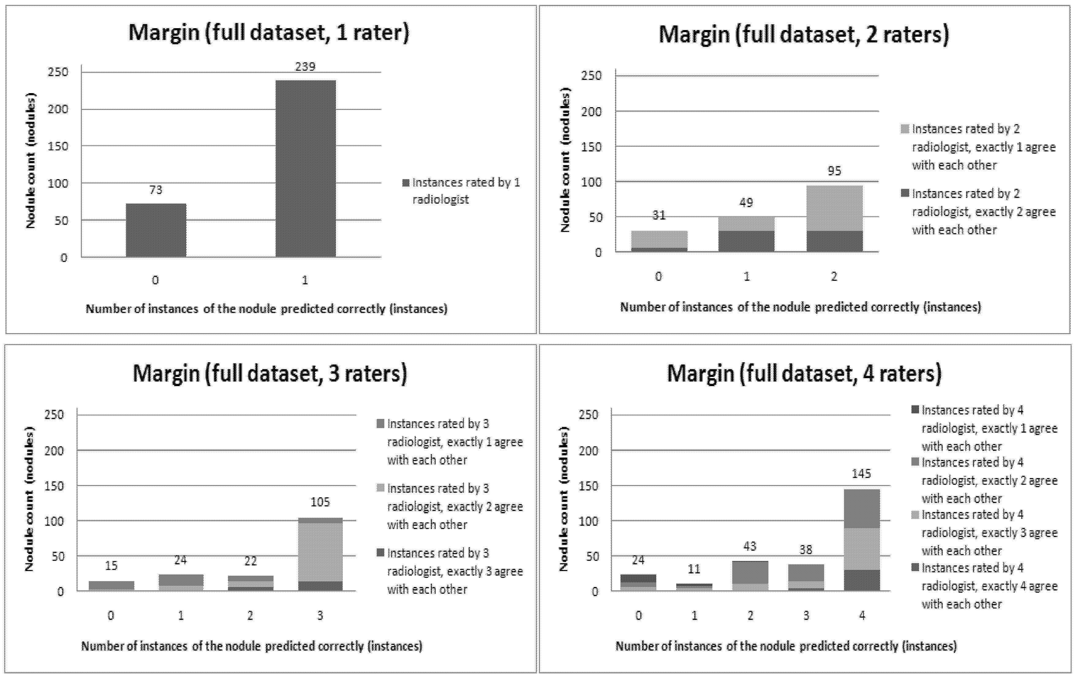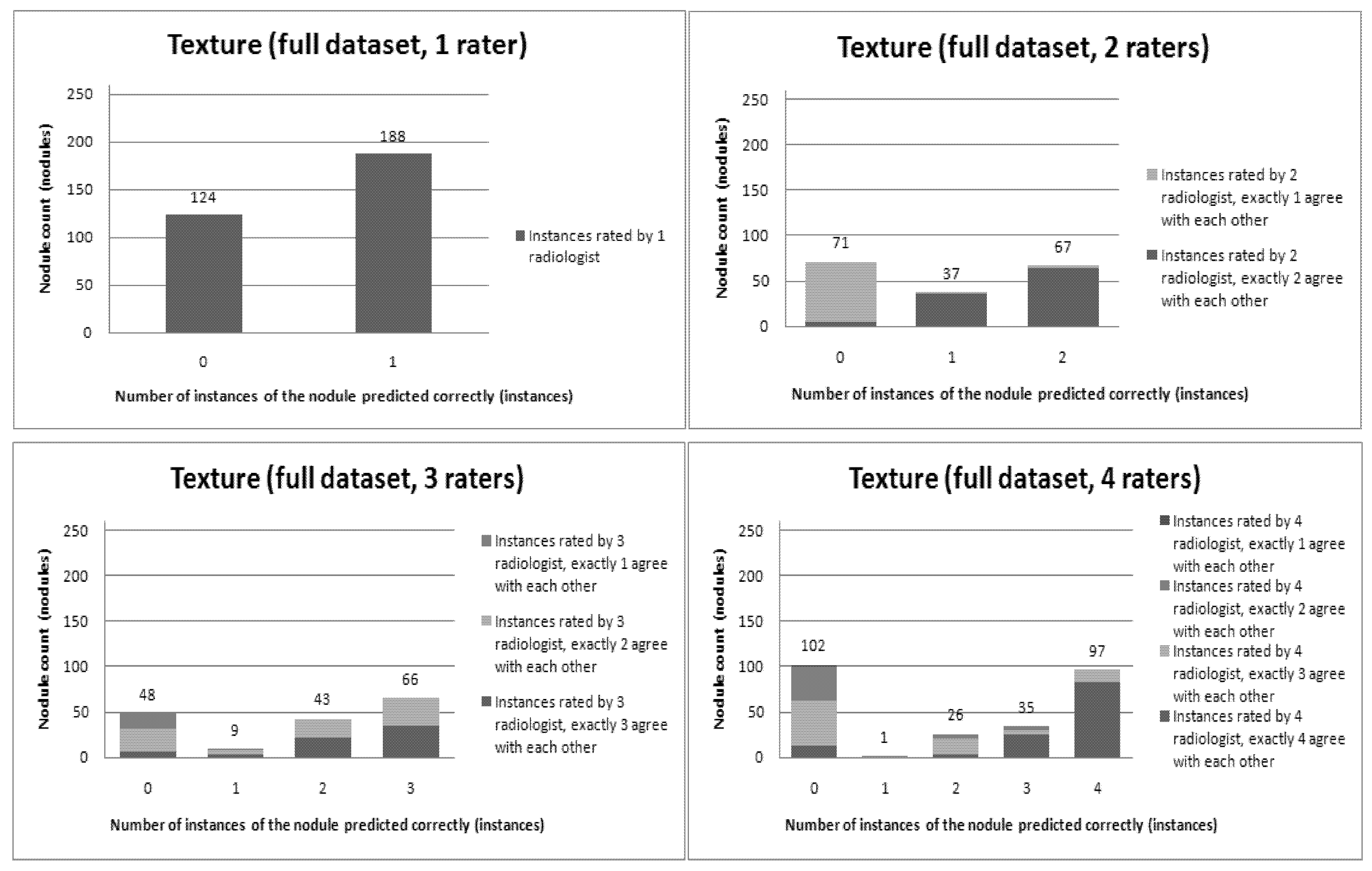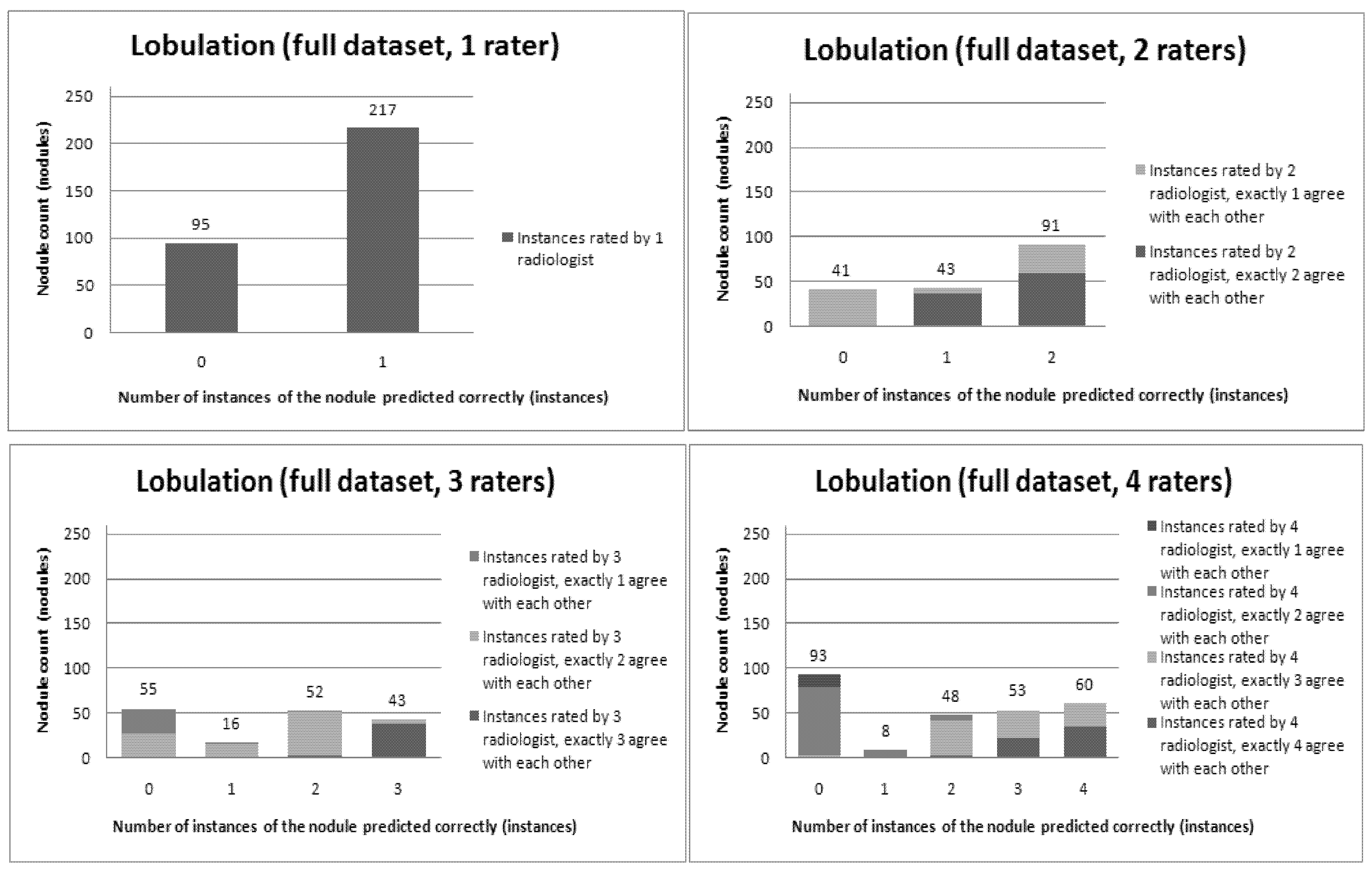 Figure 12 present a visual overview of the ensemble of classifiers’ agreement with the panel of experts’ opinions. In this visualization, we were interested not only in the “absolute” accuracy of the classifier, but also in how the classifier did with regard to rater disagreement. For each semantic characteristic, we have displayed four graphs. Each one of these graphs corresponds to a distinct number of raters. That is, we show one graph for nodules rated by one radiologist (upper left graph in each figure), one graph for nodules rated by two radiologists (upper right graph in each figure), one graph for nodules rated by three radiologists (lower left graph in each figure) and one graph for nodules rated by four radiologists (lower right graph in each figure). In each graph, we have a bar corresponding to the number of radiologists which our algorithm predicted correctly. (Thus the graphs with more radiologists have more bars.) The height of the bars shows how many nodules there were in each level of prediction success. Looking at just the height of these bars, we can see that our classifier’s success was quite good with respect to most of the semantic characteristics – these characteristics present very right-skewed distributions. Lobulation, spiculation and texture present more uniform distribution, meaning our classifier was less successful at predicting the radiologists’ labels. We present one further visualization in these graphs–each bar is gray-coded to indicate the radiologists’ level of agreement among themselves. (Thus, for example, the upper left graph, one radiologist, has no gray-coding, as a radiologist will always agree with himself.) This gray-coding allows us to see that the approach is much better at matching radiologists when the radiologists agree with themselves. While this, in itself, is not surprising, it does reveal that for the troublesome characteristics (lobulation, spiculation and texture) the algorithm does a very good job when we look only at higher levels of radiological agreement.