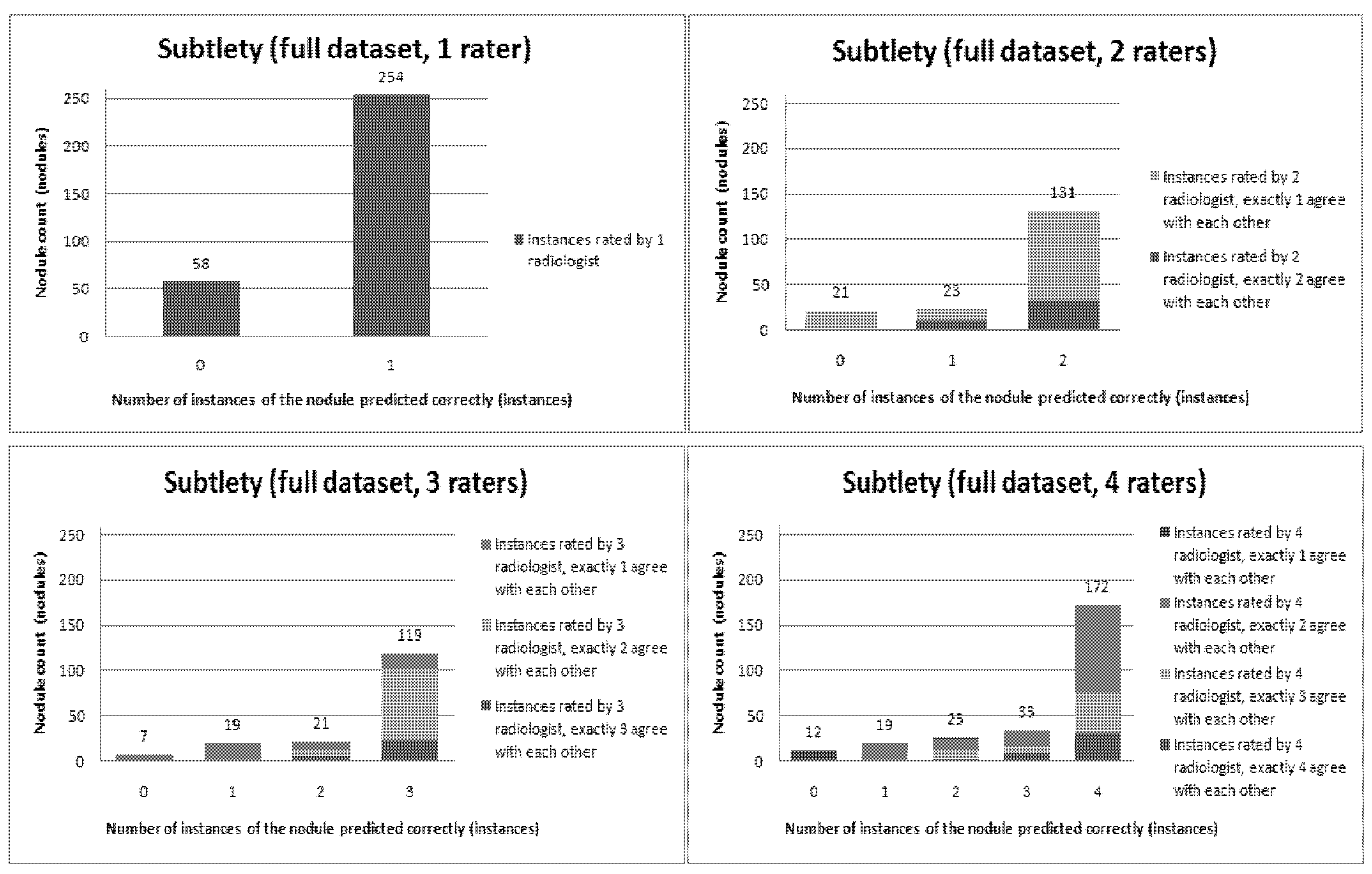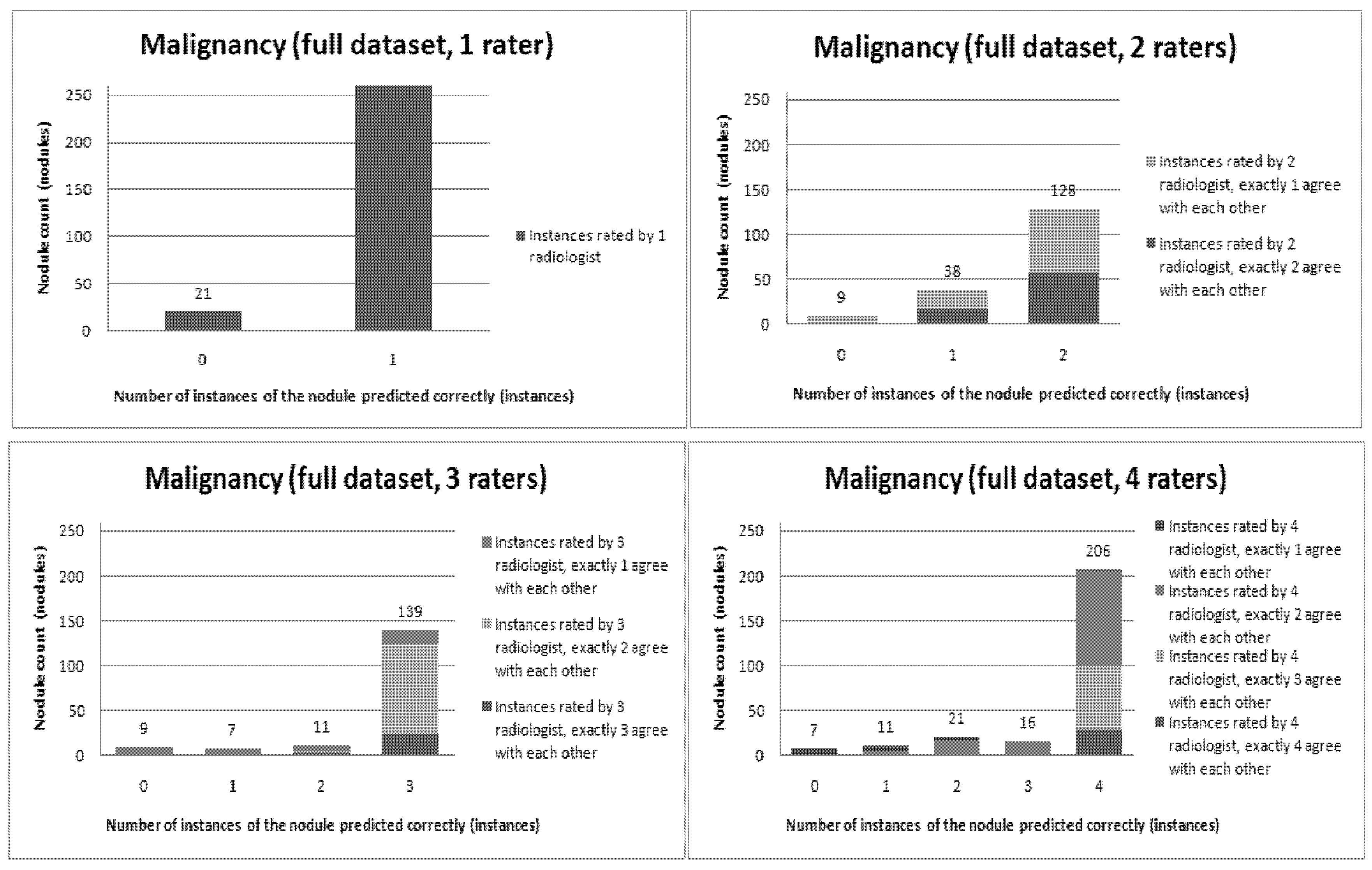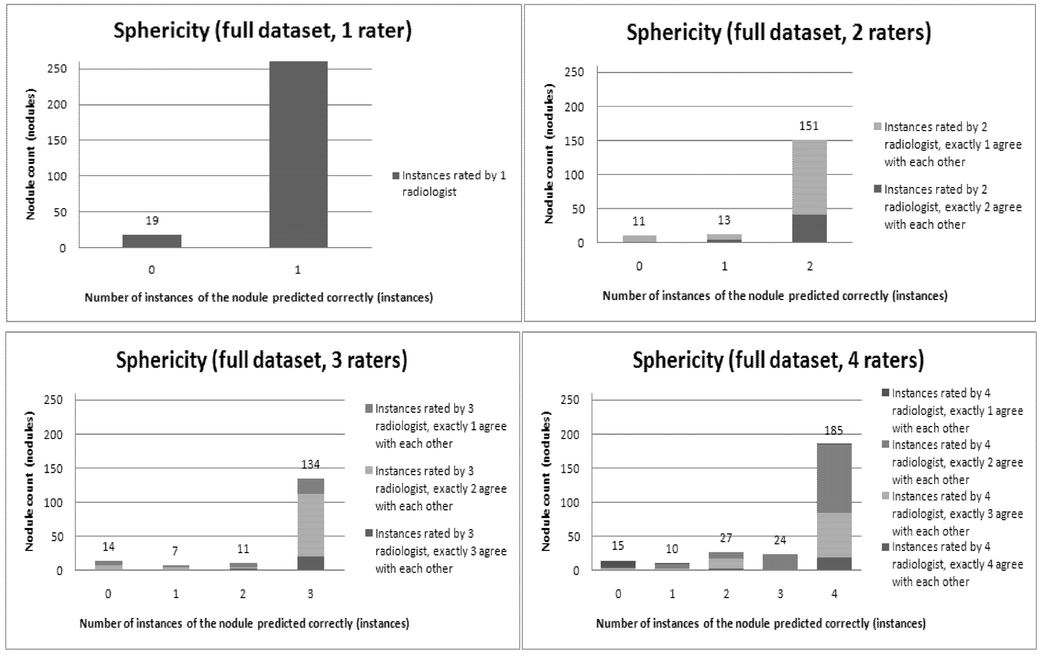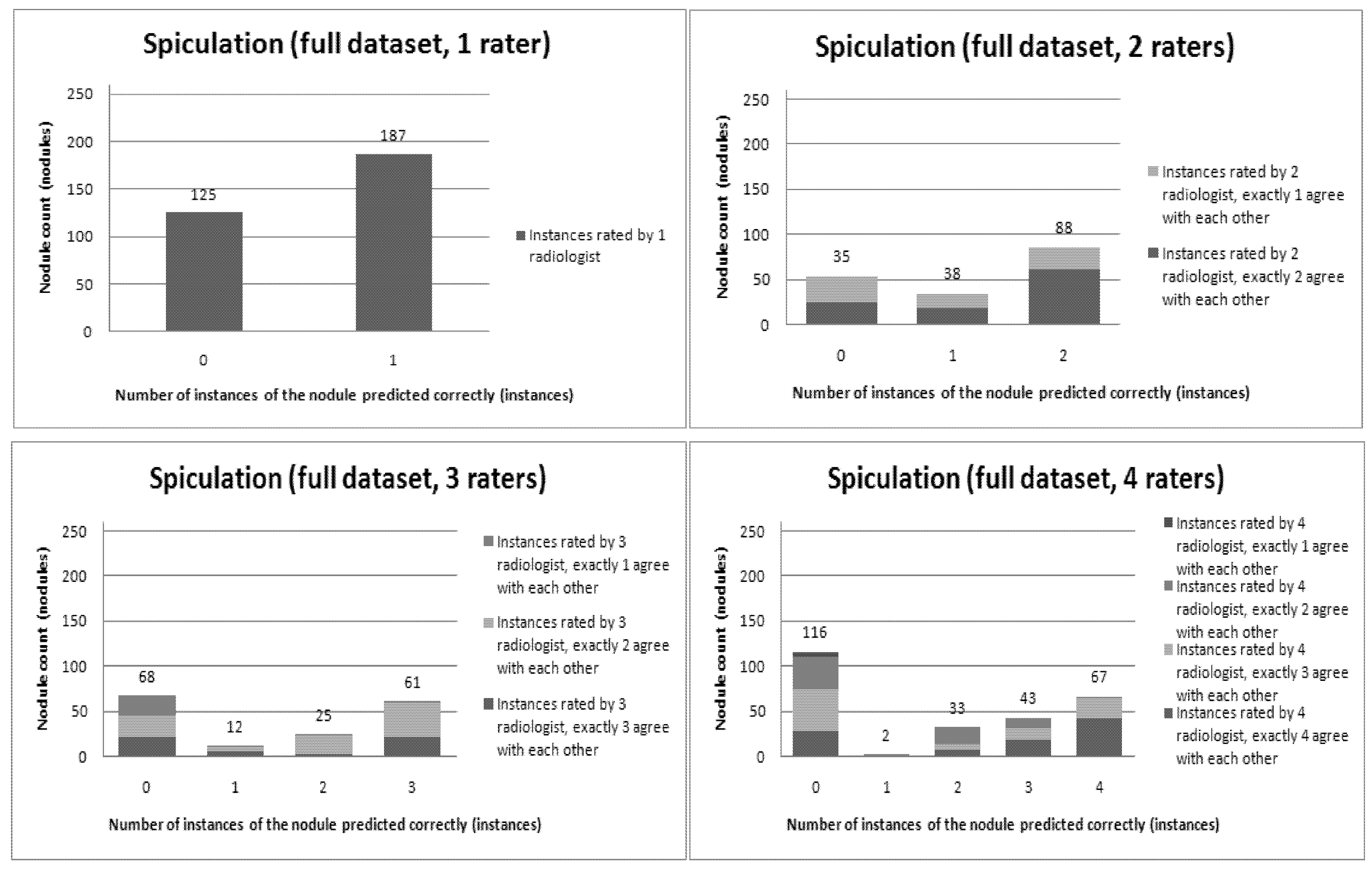 Figure 12 present a visual overview of the ensemble of classifiers’ agreement with the panel of experts’ opinions. In this visualization, we were interested not only in the “absolute” accuracy of the classifier, but also in how the classifier did with regard to rater disagreement. For each semantic characteristic, we have displayed four graphs. Each one of these graphs corresponds to a distinct number of raters. That is, we show one graph for nodules rated by one radiologist (upper left graph in each figure), one graph for nodules rated by two radiologists (upper right graph in each figure), one graph for nodules rated by three radiologists (lower left graph in each figure) and one graph for nodules rated by four radiologists (lower right graph in each figure). In each graph, we have a bar corresponding to the number of radiologists which our algorithm predicted correctly. (Thus the graphs with more radiologists have more bars.) The height of the bars shows how many nodules there were in each level of prediction success. Looking at just the height of these bars, we can see that our classifier’s success was quite good with respect to most of the semantic characteristics – these characteristics present very right-skewed distributions. Lobulation, spiculation and texture present more uniform distribution, meaning our classifier was less successful at predicting the radiologists’ labels. We present one further visualization in these graphs–each bar is gray-coded to indicate the radiologists’ level of agreement among themselves. (Thus, for example, the upper left graph, one radiologist, has no gray-coding, as a radiologist will always agree with himself.) This gray-coding allows us to see that the approach is much better at matching radiologists when the radiologists agree with themselves. While this, in itself, is not surprising, it does reveal that for the troublesome characteristics (lobulation, spiculation and texture) the algorithm does a very good job when we look only at higher levels of radiological agreement.