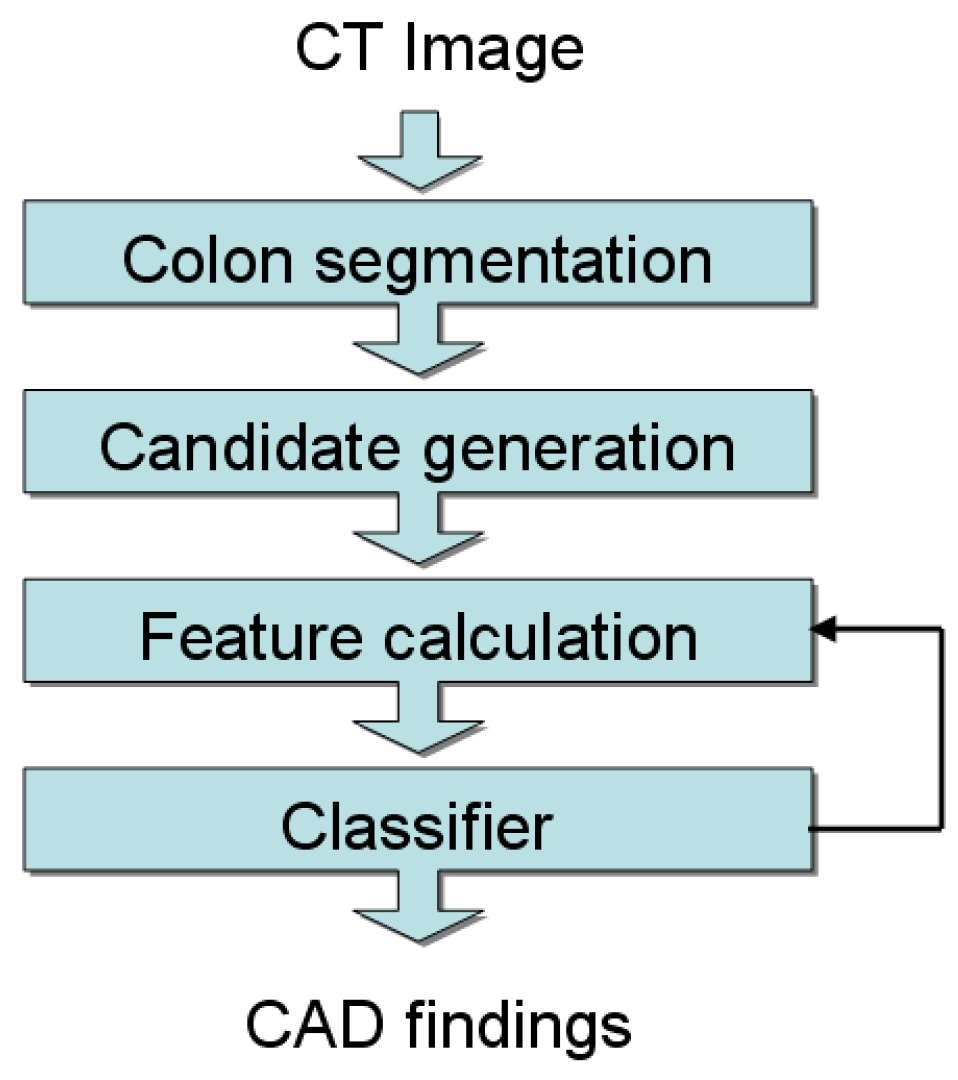 - Bogoni, L.; Cathier, P.; Dundar, M.; Jerebko, A.; Lakare, S.; Liang, J.; Periaswamy, S.; Baker, M.; Macari, M. Computer-Aided Detection (CAD) for CT Colonography: A Tool to Address a Growing Need. British J. Radiol. 2005, 78, S57–S62. [Google Scholar] [CrossRef] [PubMed]