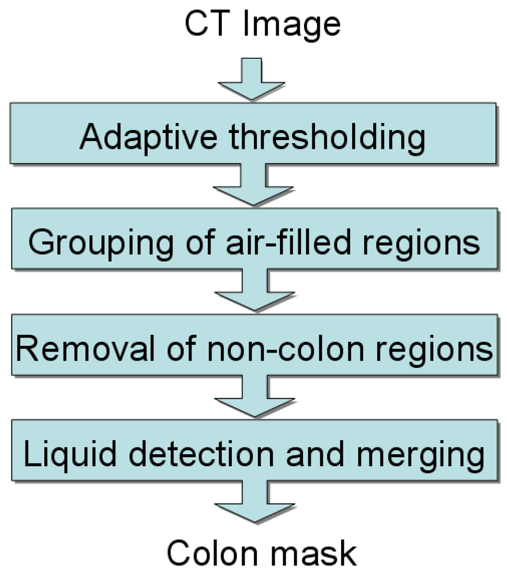 The colon segmentation step produces a binary colon mask that represents the voxels corresponding to the colon; a block diagram of this subcomponent is provided in Figure 2. When the scan is performed, the patient’s colon is distended with carbon dioxide (or air), which appears very dark in the CT image. Ideally the colon is a singly-connected air-filled region as a result of the distension, however, collapsed segments are possible. Additionally, the patient may have been administered oral contrast agents for tagging liquid and solid residues in the colon. In the CT image, these appear as very bright regions (typically with Hounsfield units (HU) ). The colon segmentation is designed to be robust to these complicating factors.