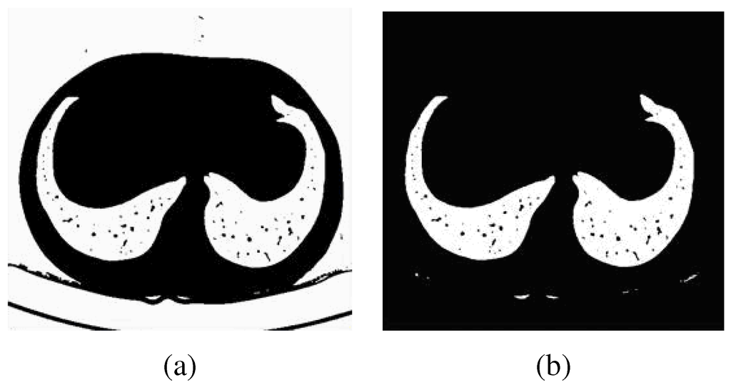 Thresholding (a) and outer air removal (b) demonstrated on an axial slice that includes the lungs.