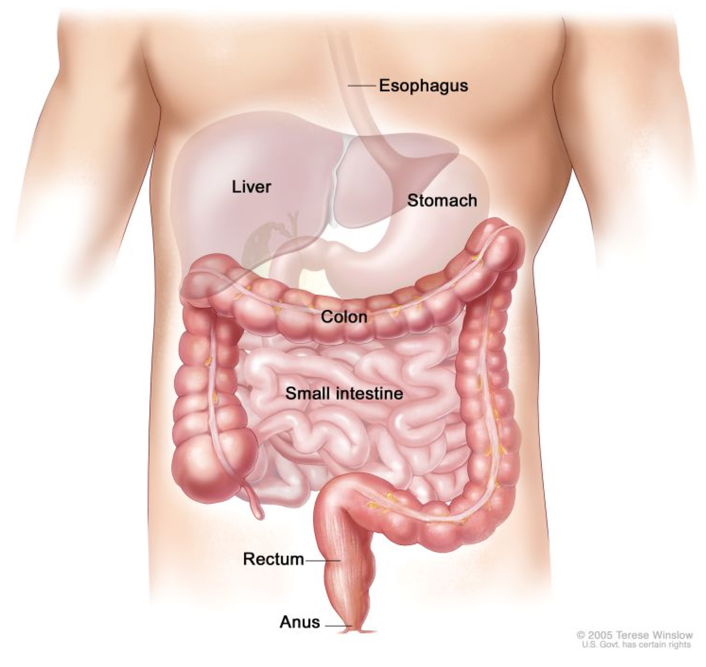 Illustration of the small bowel (intestine) and colon. Notice that the small bowel is framed by the colon in this coronal view. Public domain image courtesy of the U.S. government.