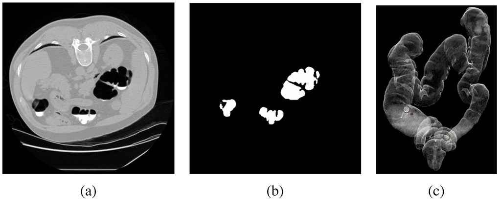 After this step, the colon segmentation is complete and the foreground voxels in the mask represent the colonic region of interest used in subsequent processing. A sample colon segmentation appears in Figure 5 (c).