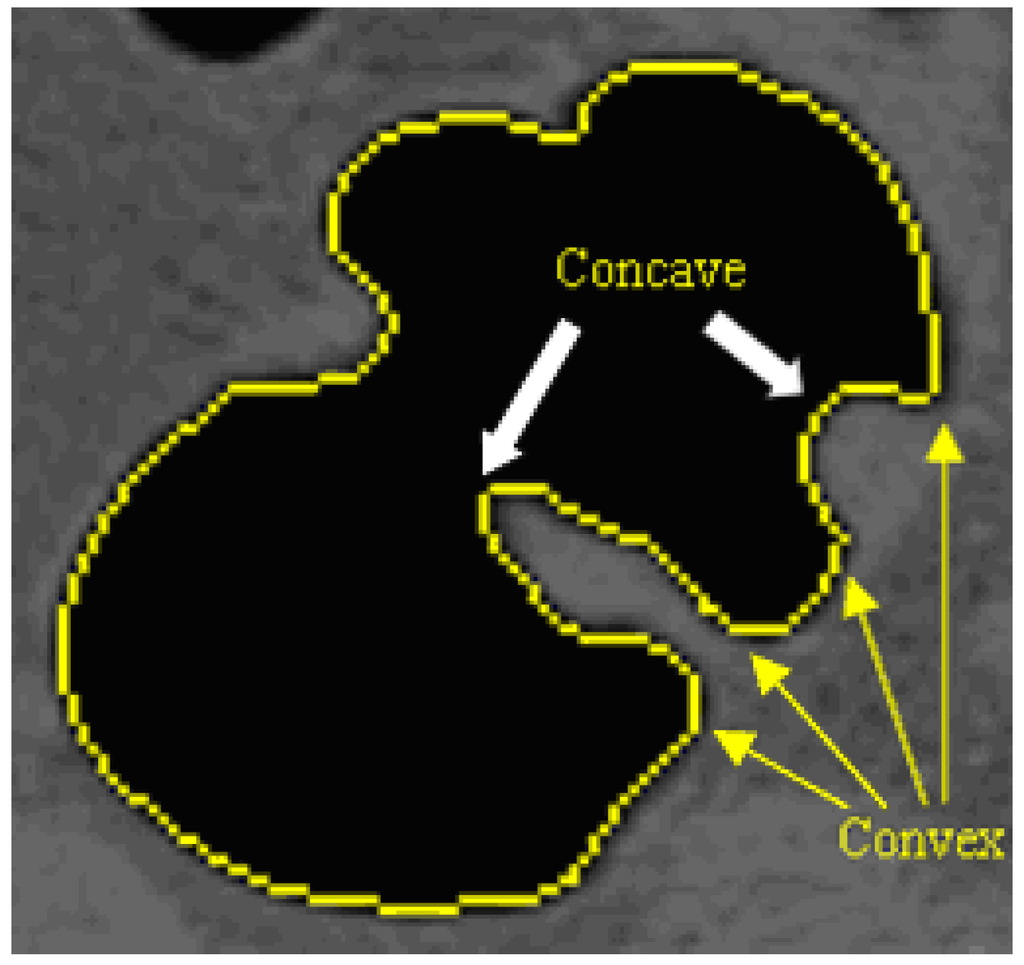 For each 2D slice, each point along the contour of the colon is analyzed in terms of its convexity. Raised objects will have at least one concave point and should be accompanied by two convex points, on either side of the concave point, where the object is attached to the surface. Examples are shown in Figure 6. From this convexity determination, raised objects are extracted from the image.