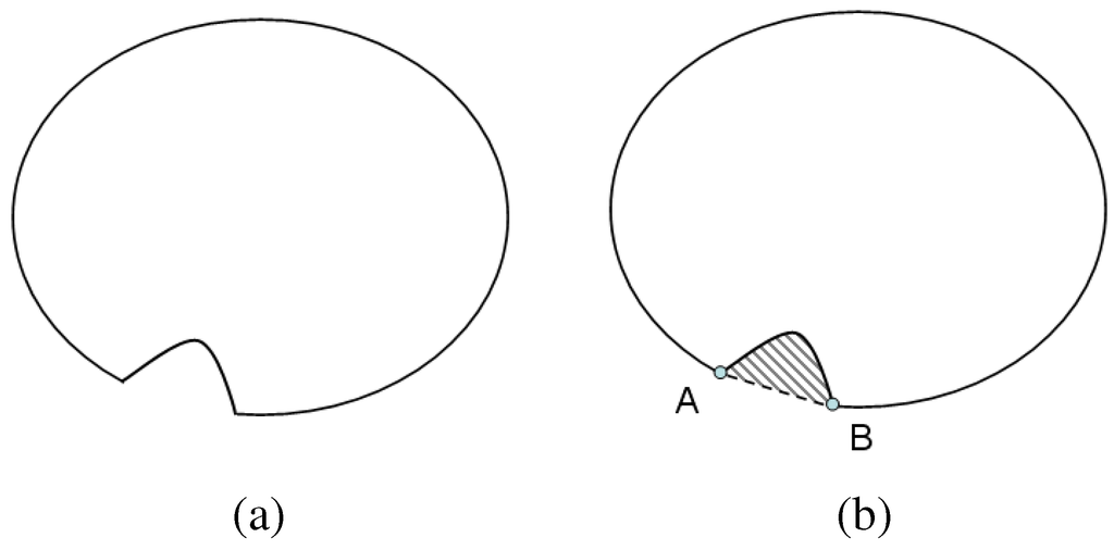 where . Critical points are those for which this classification changes; i.e., points where the convexity/concavity transitions. The concave regions of the contour are identified, and the convex critical points defining the start and end points of the raised object are detected. A line between the two critical points is drawn, and the 2D region defined by this line and the concave part of the contour is stored as a 2D candidate. A schematic illustration is provided in Figure 7.